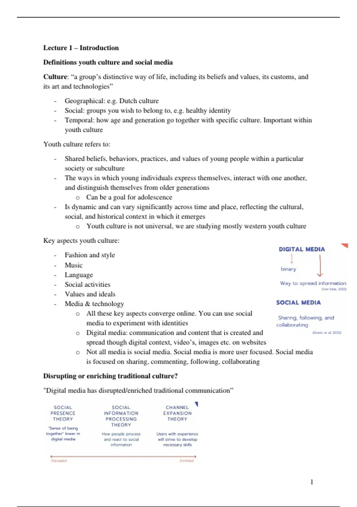 Aantekeningen youth culture in a digital world. Alle slides en plaatjes overgenomen, inclusief extra uitleg gegeven in de colleges. Hierdoor een 9 gehaald