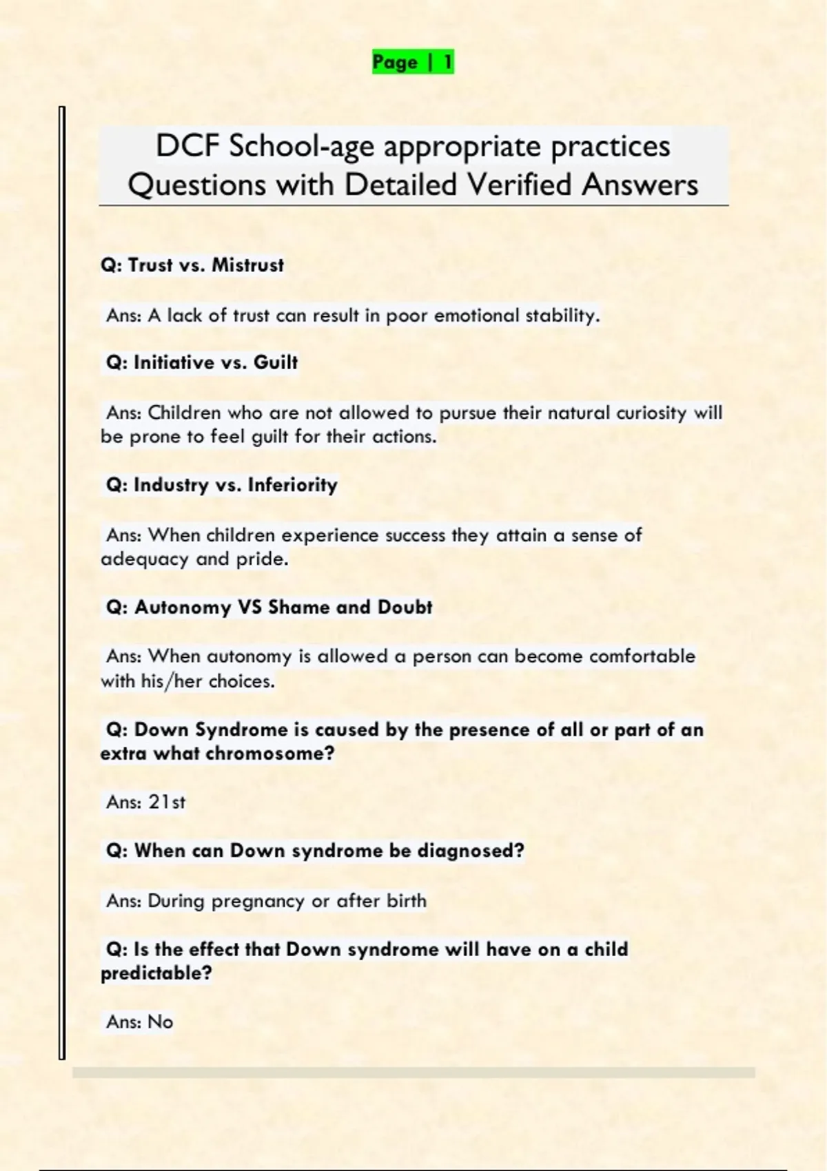 Q: Trust vs. Mistrust Ans: A lack of trust can result in poor emotional stability. Q: Initiative vs. Guilt Ans: Children who are not allowed to pursue their natural curiosity will be prone to feel guilt for their actions. Q: Industry vs. Inferiority Ans: When children experience success they attain a sense of adequacy and pride. Q: Autonomy VS Shame and Doubt Ans: When autonomy is allowed a person can become comfortable with his/her choices. Q: Down Syndrome is caused by the presence of all or part of an extra what chromosome? Ans: 21st Q: When can Down syndrome be diagnosed? Ans: During pregnancy or after birth Q: Is the effect that Down syndrome will have