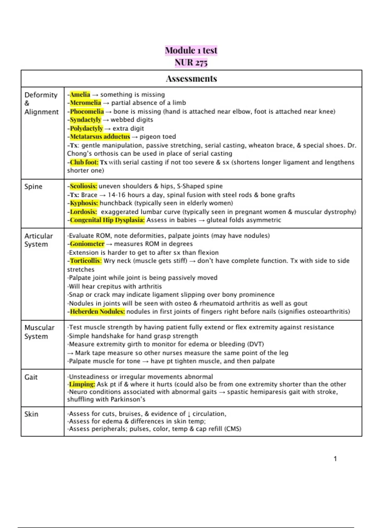 -Heberden Nodules: nodules in first joints of fingers right before nails (signifies osteoarthritis)
