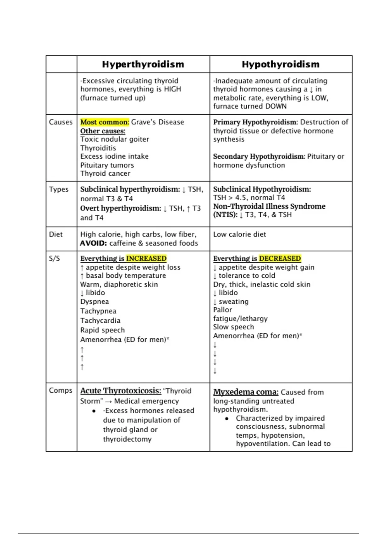 Side by side simplified chart comparison of hyperthyroidism vs hypothyroidism. Includes types, s/s, diet, nursing interventions, treatments, & post-op/pt teaching.