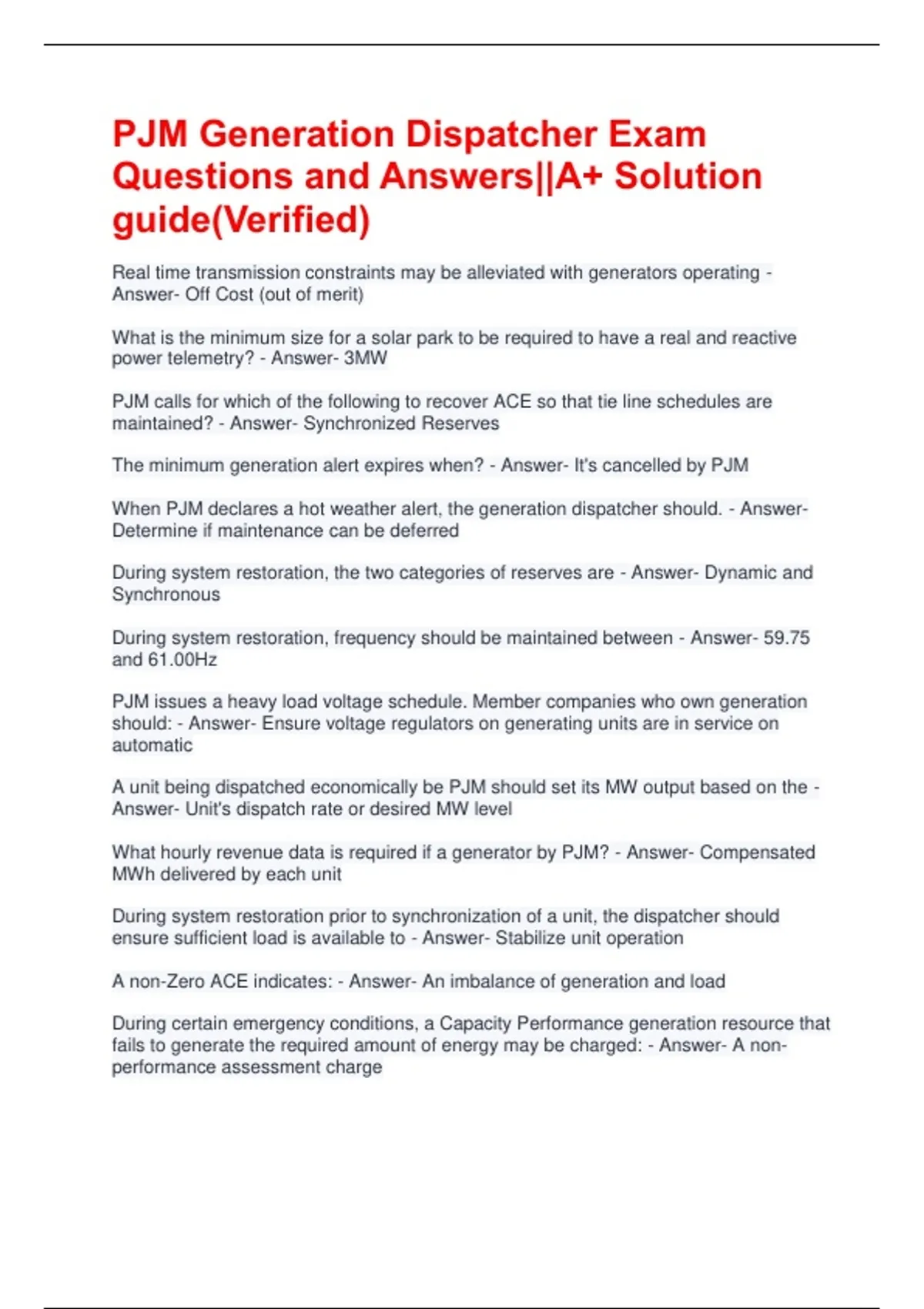 PJM Generation Dispatcher Exam Questions and Answers||A+ Solution guide(Verified) Real time transmission constraints may be alleviated with generators operating - Answer- Off Cost (out of merit) What is the minimum size for a solar park to be required to have a real and reactive power telemetry? - Answer- 3MW PJM calls for which of the following to recover ACE so that tie line schedules are maintained? - Answer- Synchronized Reserves The minimum generation alert expires when? - Answer- It's cancelled by PJM When PJM declares a hot weather alert, the generation dispatcher should. - Answer- Determine if maintenance can be deferred During system restoration, the two categories of reserves are - Answer- Dynamic and Synchronous During system restoration, frequency should be maintained between - Answer- 59.75 and 61.00Hz PJM issues a heavy load voltage schedule. Member companies who own generation should: - Answer- Ensure voltage regulators on generating units are in service on automatic A unit being dispatched economically be PJM should set its MW output based on the - Answer- Unit's dispatch rate or desired MW level What hourly revenue data is required if a generator by PJM? - Answer- Compensated MWh delivered by each unit During system restoration prior to synchronization of a unit, the dispatcher should ensure sufficient load is available to - Answer- Stabilize unit operation A non-Zero ACE indicates: - Answer- An imbalance of generation and load During certain emergency conditions, a Capacity Performance generation resource that fails to generate the required amount of energy may be charged: - Answer- A non-performance assessment charge Control center facilities must have a minimum of how many days of fuel for the backup generator? - Answer- 3 days Which of the following one-way communication system is used to disseminate information to market operation centers? - Answer- All call Real time bus prices may be monitored using A. Data Viewer. B. eDART. C. InSchedule. D. Markets Gateway. - Answer- Data Viewer Which action is a violation of PJM two settlement market rules? - Answer- Not offering an available PJM capacity resource into the day ahead market A unit fails to start when scheduled, would be classified as which of the following types of outage? - Answer- Unplanned A forecasted planned outage starts a minimum of how many days into the future? - Answer- 31 days Maintenance outages are permitted when - Answer- A unit can be held online until the following Monday, and system reliability is not affected If PJM ACE shows overgeneration, actual imports are - Answer- Less than scheduled Who should a generator contact at PJM to clear an outage ticket? - Answer- Master Coordinator Which page in Markets Gateway is used to reflect real-time changes to unit status and output? - Answer- Unit Hourly Updates The loss of a large generation unit on the PJM system can be detected by monitoring what: - Answer- Frequency and PJM area control error. A 1000MW unit has tripped in the PJM control area and the the PJM ACE now indicates undergeneration of 1050MW. What immediate action should be taken by PJM to recover the ACE? - Answer- Request 100% synchronized reserves be loaded Which of the following emergency procedures are issued in advance of a scheduled load period to allow sufficient time for the generation dispatcher to prepare for the anticipated capacity shortages? - Answer- Alerts The amount of synchronized reserves must be large enough to cover the loss of - Answer- The largest single contingency PJM responds to capacity shortages by issuing alerts - Answer- In advance of a scheduled load period to allow sufficient time for members to prepare for anticipated initial capacity shortages.