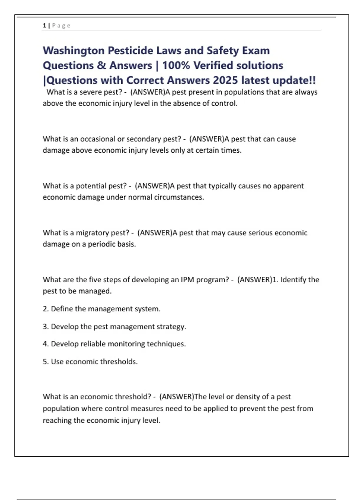 Washington Pesticide Laws and Safety Exam Questions & Answers | 100% Verified solutions |Questions with Correct Answers 2025 latest update!!