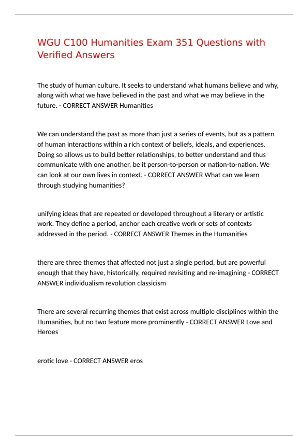 WGU C100 Humanities Exam 351 Questions with Verified Answers The study of human culture. It seeks to understand what humans believe and why, along with what we have believed in the past and what we may believe in the future. - CORRECT ANSWER Humanities We can understand the past as more than just a series of events, but as a pattern of human interactions within a rich context of beliefs, ideals, and experiences. Doing so allows us to build better relationships, to better understand and thus communicate with one another, be it person-to-person or nation-to-nation. We can look at our own lives in context. - CORRECT ANSWER What can we learn through studying humanities? unifying ideas that are repeated or developed throughout a literary or artistic work. They define a period, anchor each creative work or sets of contexts addressed in the period. - CORRECT ANSWER Themes in the Humanities there are three themes that affected not just a single period, but are powerful enough that they have, historically, required revisiting and re-imagining - CORRECT ANSWER individualism revolution classicism There are several recurring themes that exist across multiple disciplines within the Humanities, but no two feature more prominently - CORRECT ANSWER Love and Heroes erotic love - CORRECT ANSWER eros Platonic love - CORRECT ANSWER Agape found in virtually every culture and society because the "heart" of the hero's journey is fundamentally the same everywhere. It satisfies a psychological need to see the individual (to see oneself) as capable of stupendous feats (physical, mental, or moral) against seemingly insurmountable and antagonistic forces. It is alive today, taking form as (for example) an exalted political candidate, sports superstar, or glamorous pop culture celebrity. - CORRECT ANSWER hero archetype It can be defined as the study of the creative and intellectual contributions made by all cultures and as an ethical system that emphasizes human reason, values and the scientific method. - CORRECT ANSWER Humanism