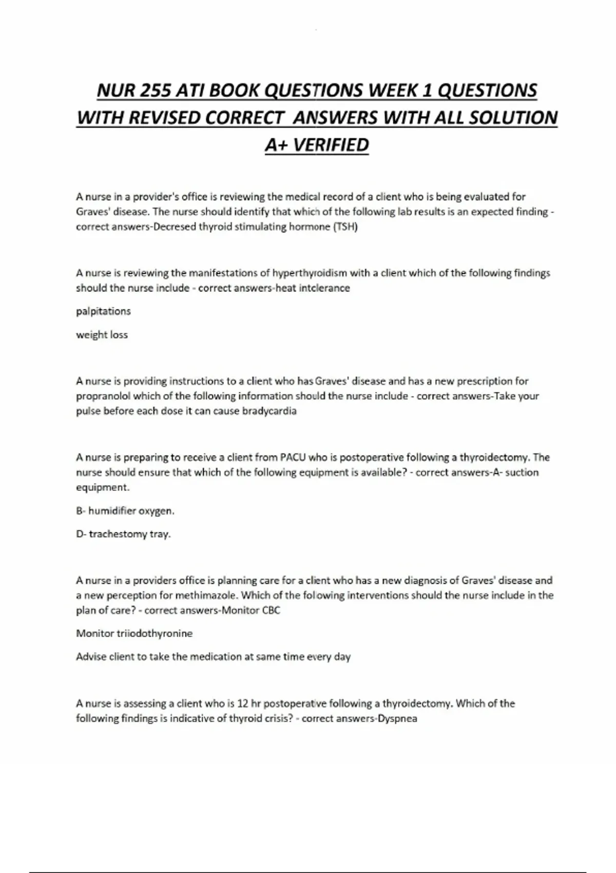 NUR 255 ATI BOOK QUESTIONS WEEK 1 QUESTIONS WITH REVISED CORRECT ANSWERS WITH ALL SOLUTION A+ VERIFIED A nurse in a provider's office is reviewing the medical record of a client who is being evaluated for Graves' disease. The nurse should identify that which of the following lab results is an expected finding - correct answers-Decresed thyroid stimulating hormone (TSH) A nurse is reviewing the manifestations of hyperthyroidism with a client which of the following findings should the nurse include - correct answers-heat intolerance palpitations weight loss A nurse is providing instructions to a client who has Graves' disease and has a new prescription for propranolol which of the following information should the nurse include - correct answers-Take your pulse before each dose it can cause bradycardia A nurse is preparing to receive a client from PACU who is postoperative following a thyroidectomy. The nurse should ensure that which of the following equipment is available? - correct answers-A- suction equipment. B- humidifier oxygen. D- trachestomy tray. A nurse in a providers office is planning care for a client who has a new diagnosis of Graves' disease and a new perception for methimazole. Which of the following interventions should the nurse include in the plan of care? - correct answers-Monitor CBC Monitor triiodothyronine