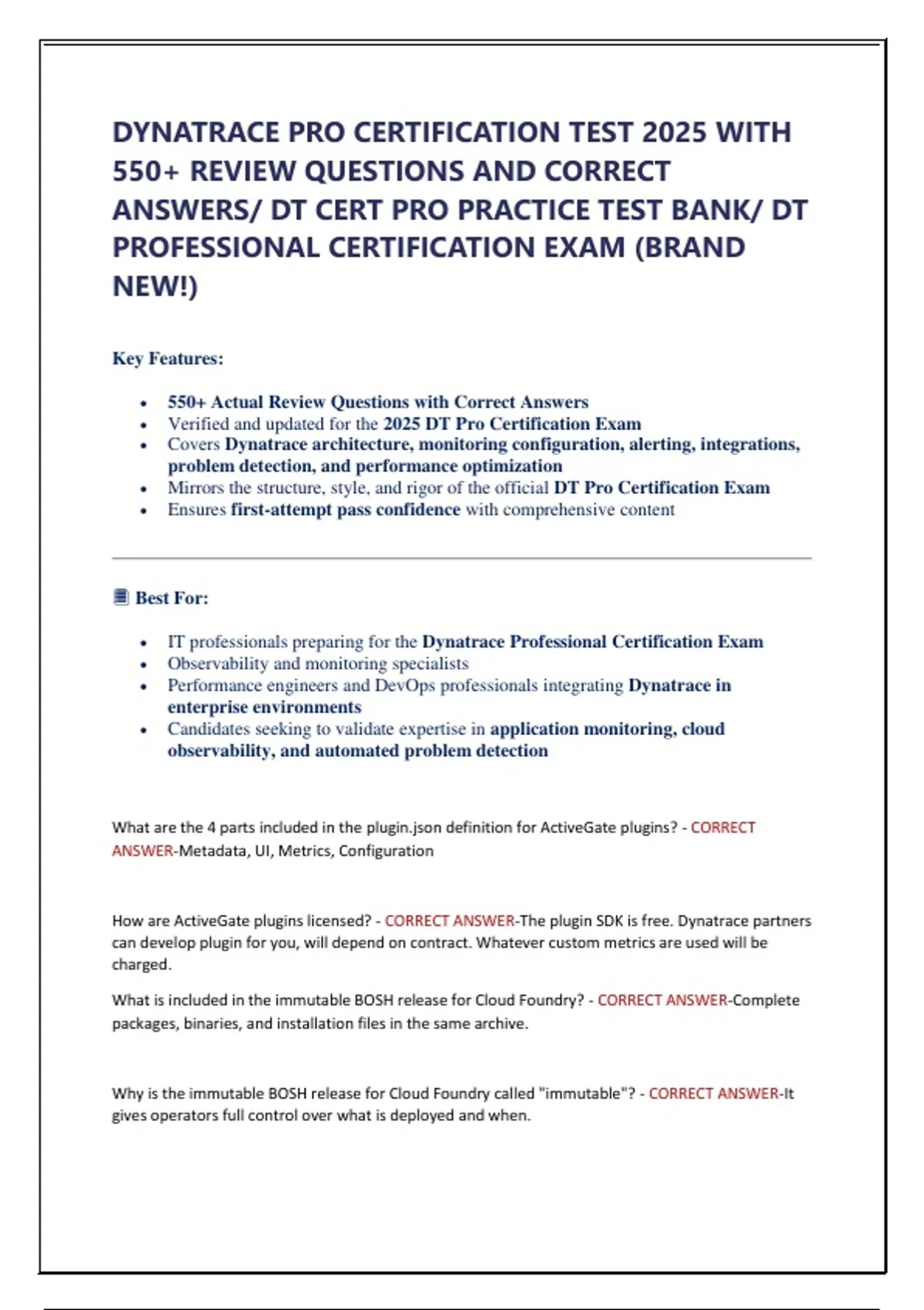 The Dynatrace Professional Certification Test Bank is the most updated and reliable prep resource for the 2025 certification cycle. This package includes 550+ real exam-style review questions with 100% correct, verified answers, designed to help candidates master all concepts and pass on their first attempt.