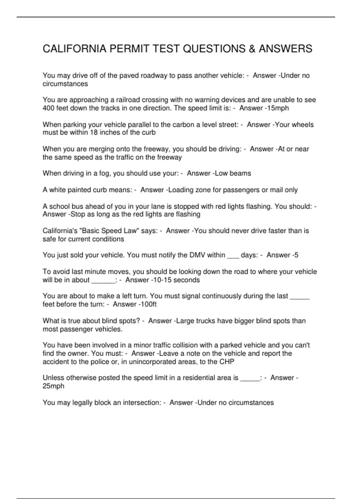 CALIFORNIA PERMIT TEST QUESTIONS & ANSWERS
