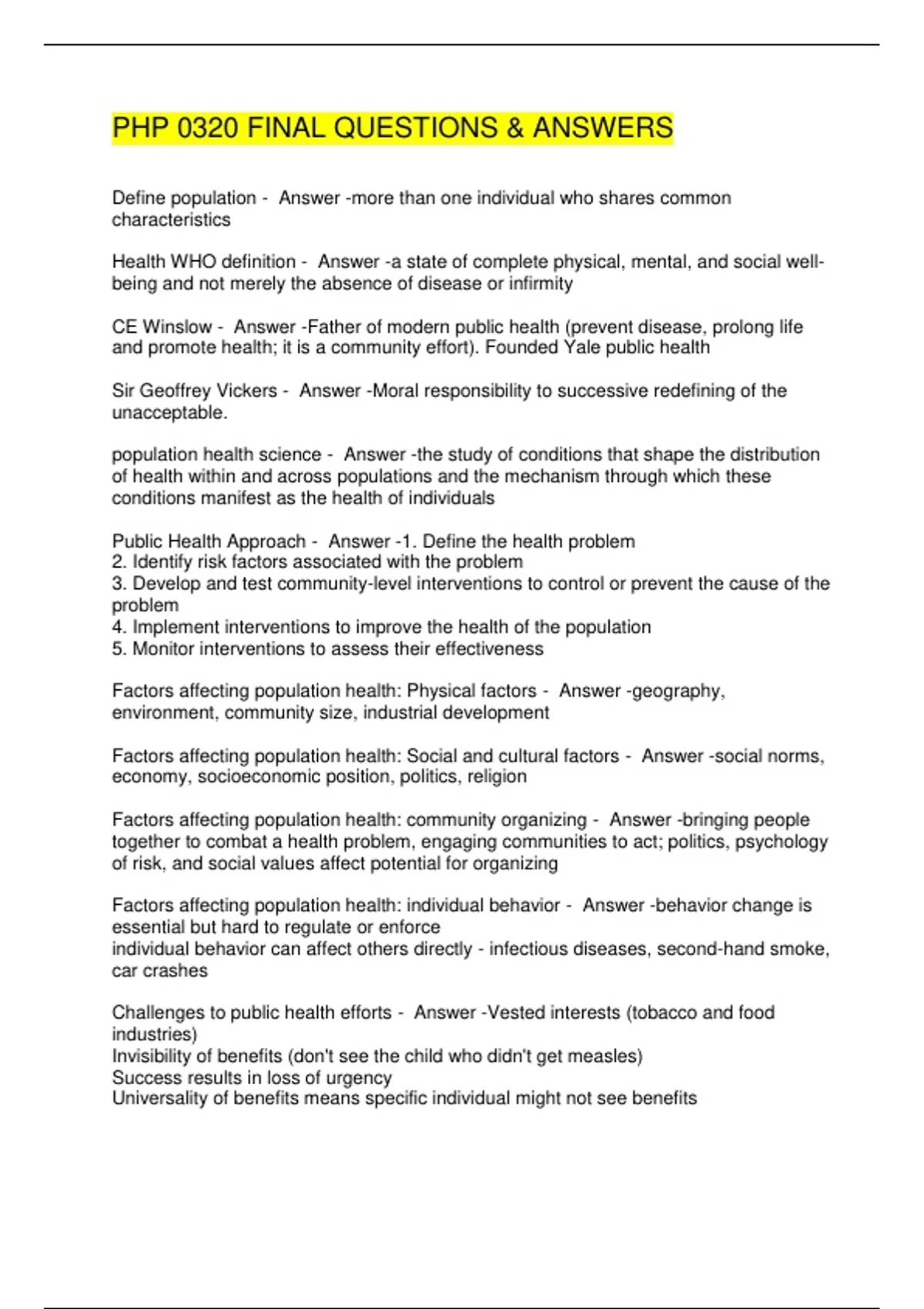 PHP 0320 FINAL QUESTIONS & ANSWERS