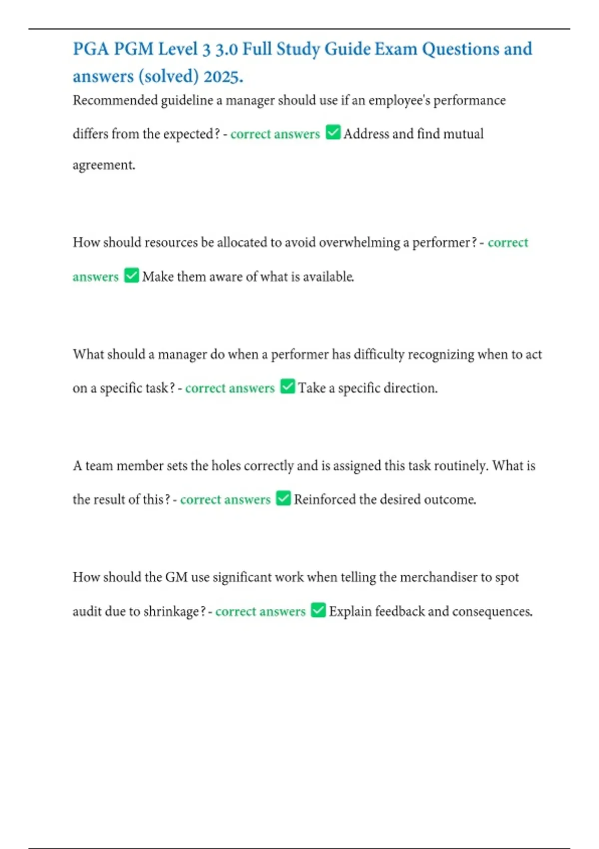 This document provides the full study guide for PGA PGM Level 3, including all modules and topics covered in the program. It contains the correct answers to practice questions, making it a comprehensive preparation tool. The material is structured to align with the official curriculum and is suitable for exam revision and self-study