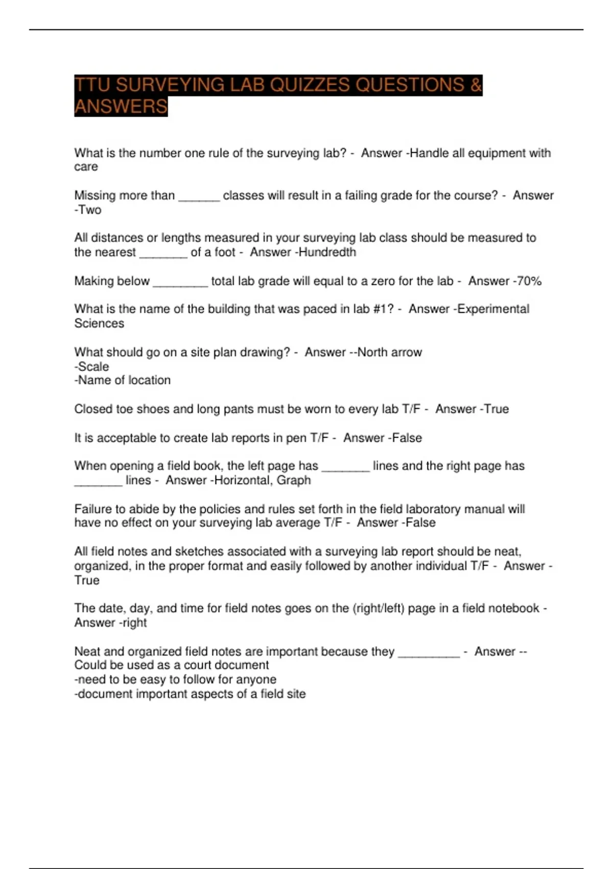 TTU SURVEYING LAB QUIZZES QUESTIONS & ANSWERS