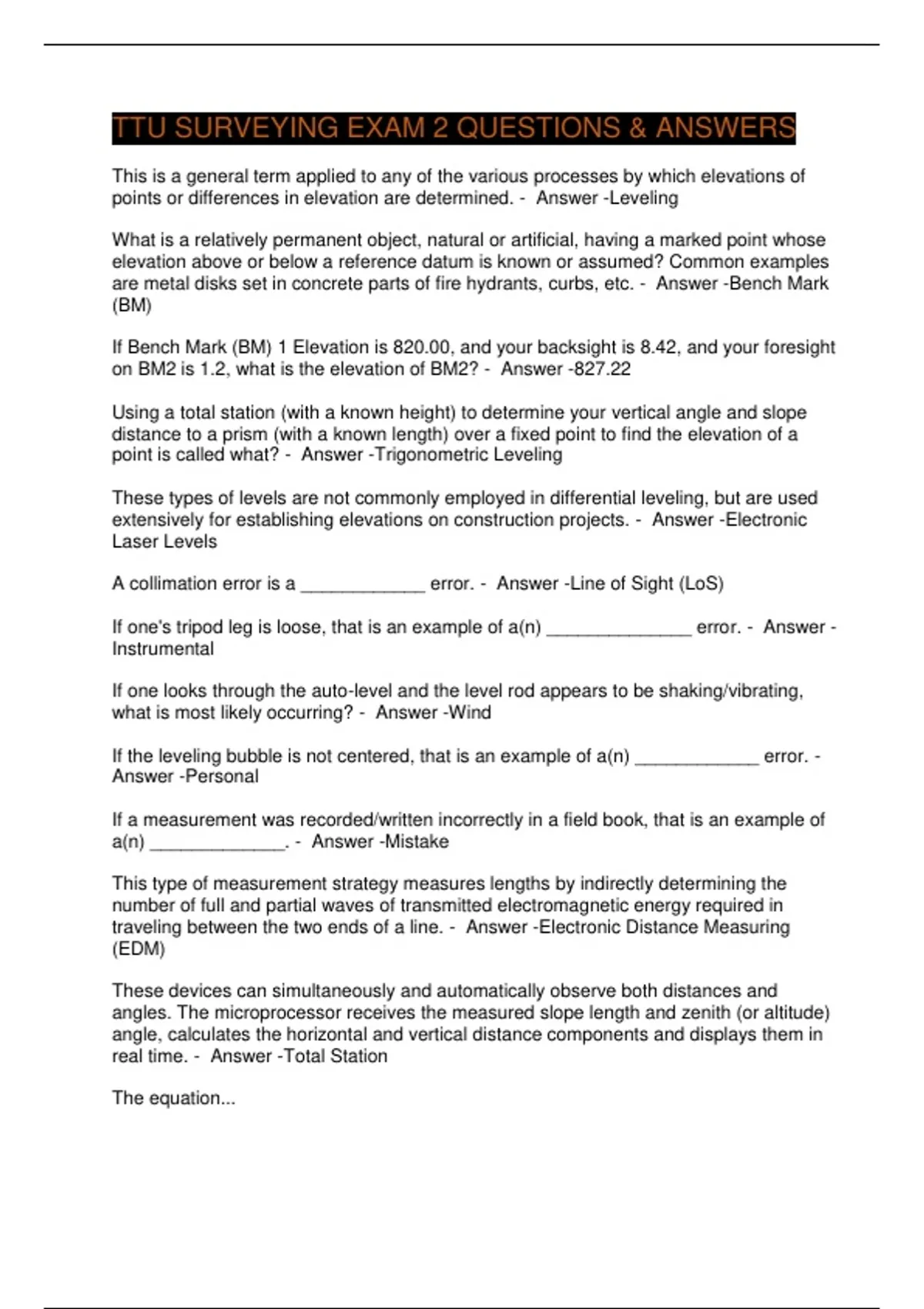 TTU SURVEYING EXAM 2 QUESTIONS & ANSWERS