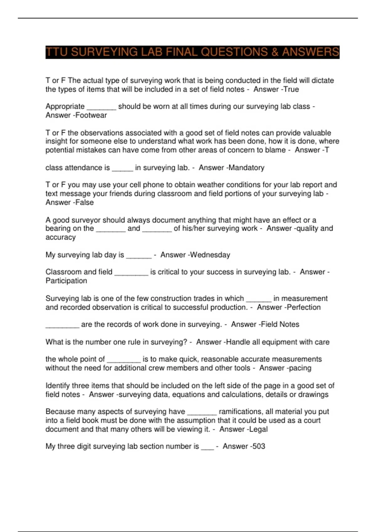 TTU SURVEYING LAB FINAL QUESTIONS & ANSWERS