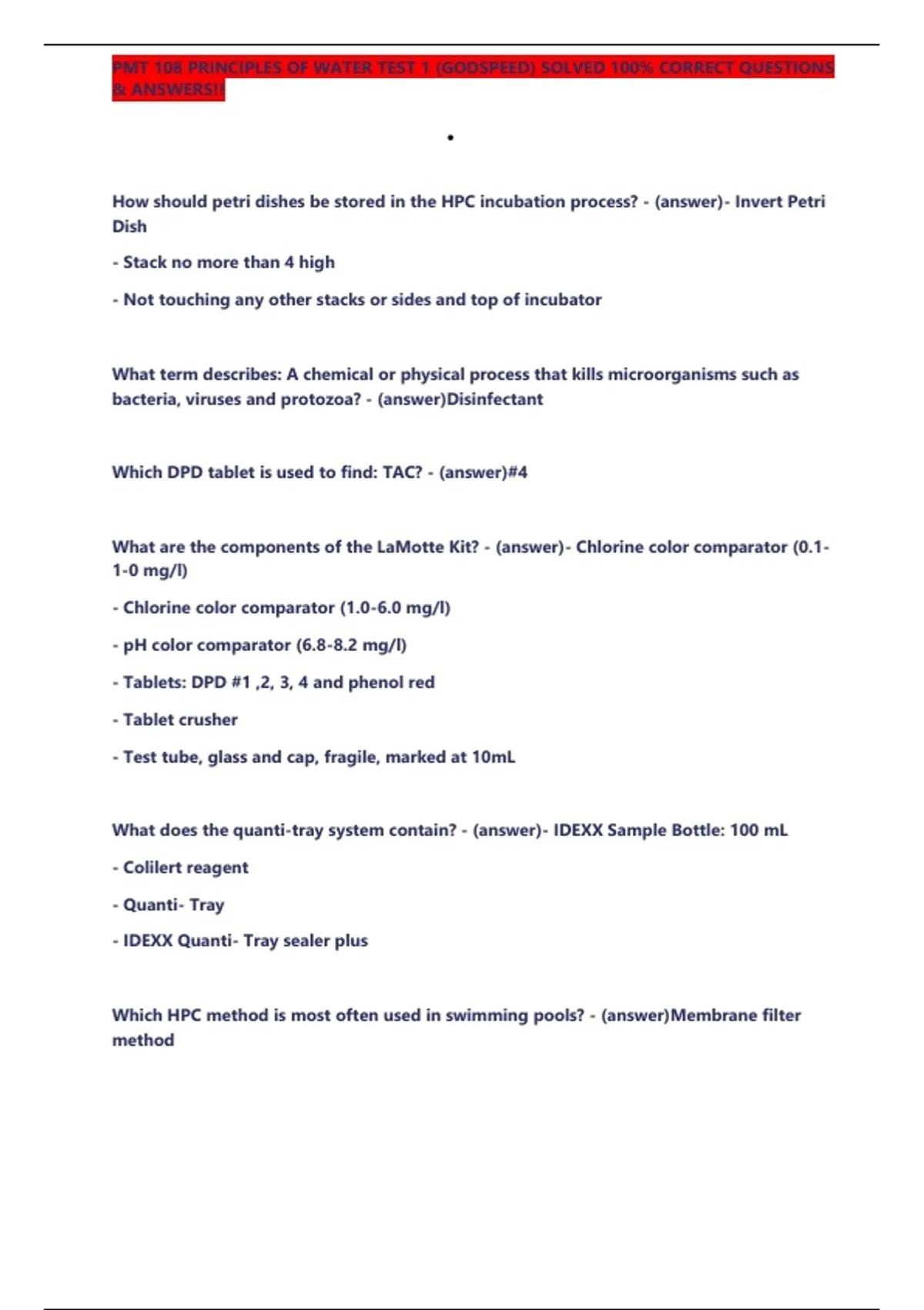 PMT 108 PRINCIPLES OF WATER TEST 1 (GODSPEED) SOLVED 100% CORRECT QUESTIONS & ANSWERS!!