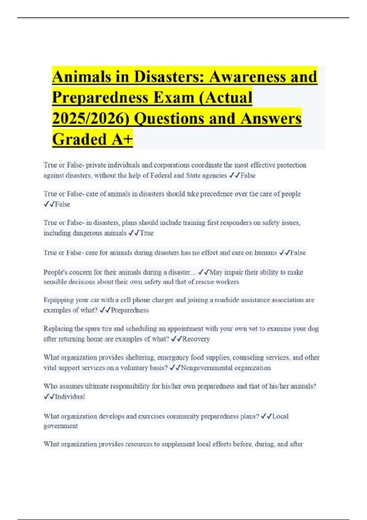 Animals in Disasters: Awareness and Preparedness Exam (Actual 2025/2026) Questions and Answers Graded A+