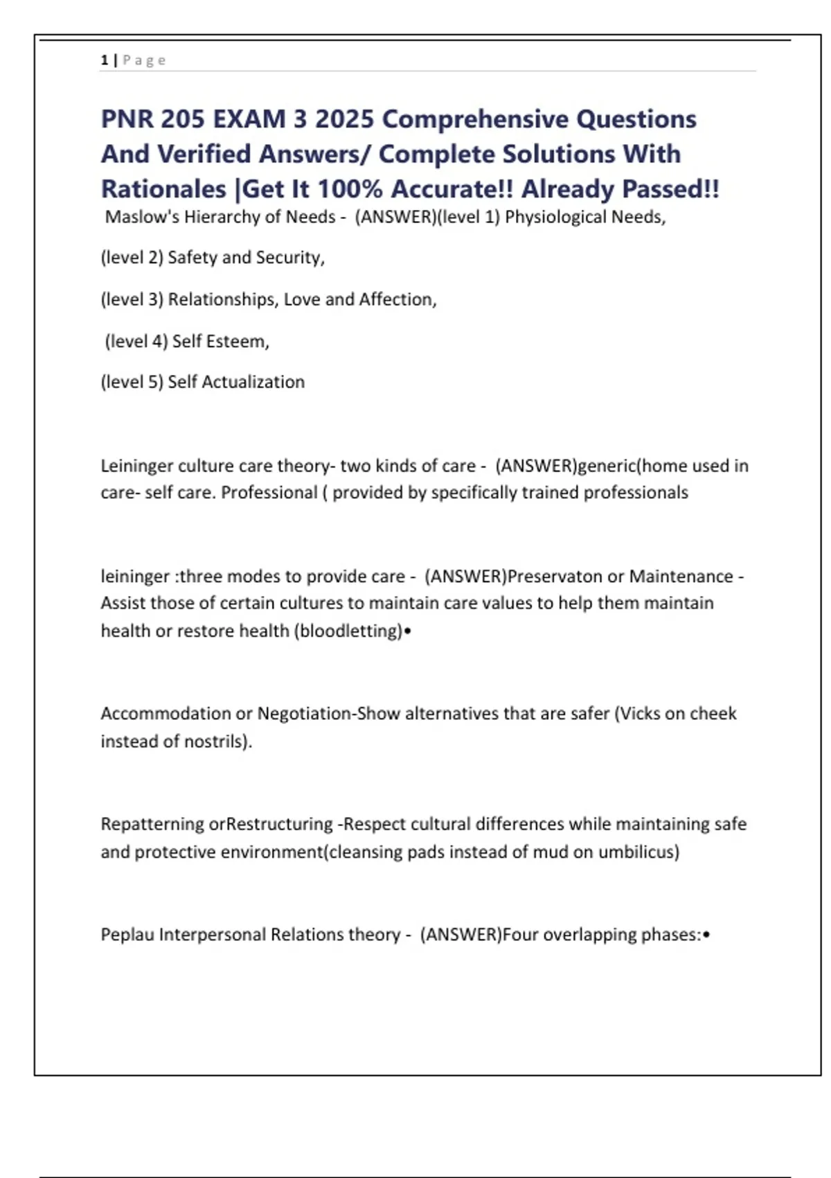 PNR 205 EXAM 3 2025 Comprehensive Questions And Verified Answers/ Complete Solutions With Rationales |Get It 100% Accurate!! Already Passed!!