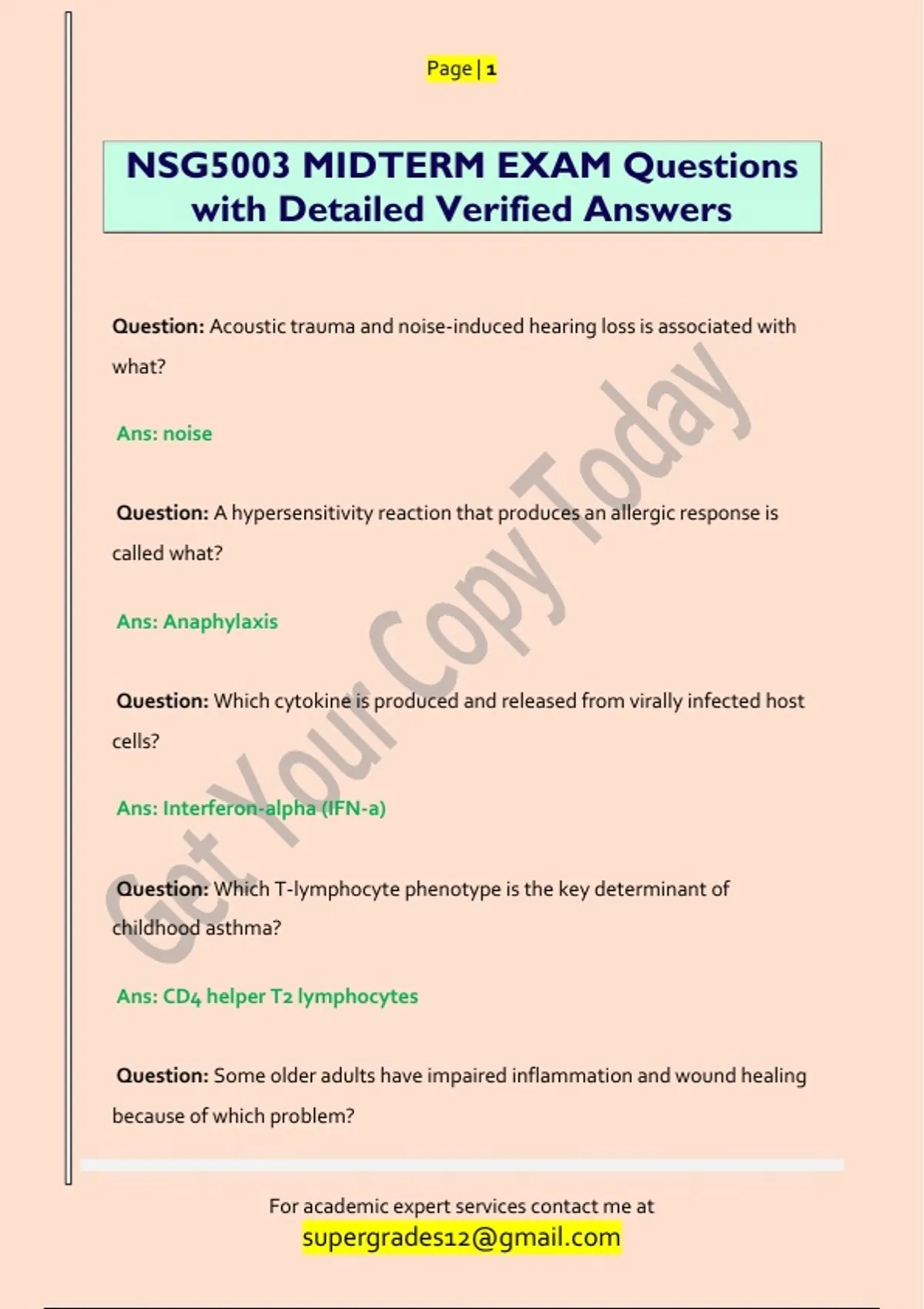 Question: Acoustic trauma and noise-induced hearing loss is associated with what? Ans: noise Question: A hypersensitivity reaction that produces an allergic response is called what? Ans: Anaphylaxis Question: Which cytokine is produced and released from virally infected host cells? Ans: Interferon-alpha (IFN-a) Question: Which T-lymphocyte phenotype is the key determinant of childhood asthma? Ans: CD4 helper T2 lymphocytes Question: Some older adults have impaired inflammation and wound healing because of which problem?
