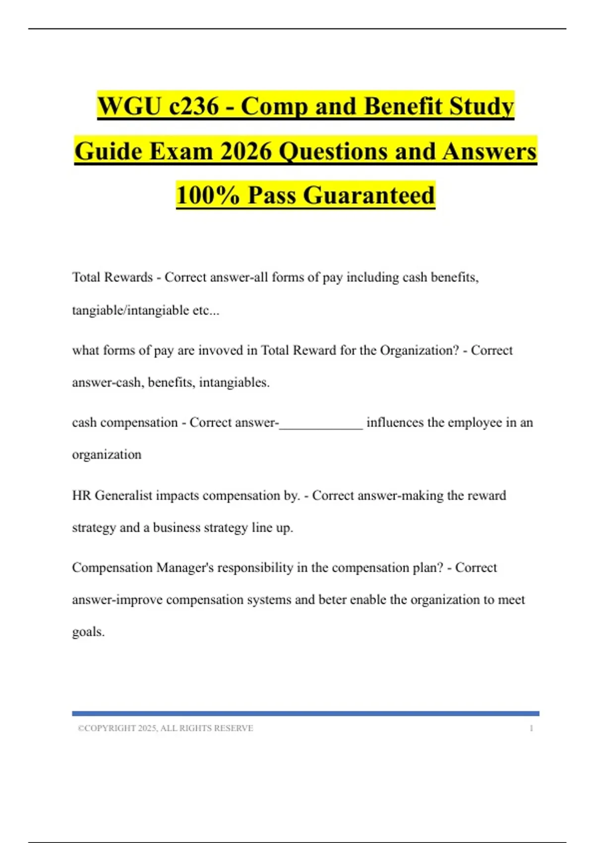 WGU c236 - Comp and Benefit Study Guide Exam 2026 Questions and Answers 100% Pass Guaranteed