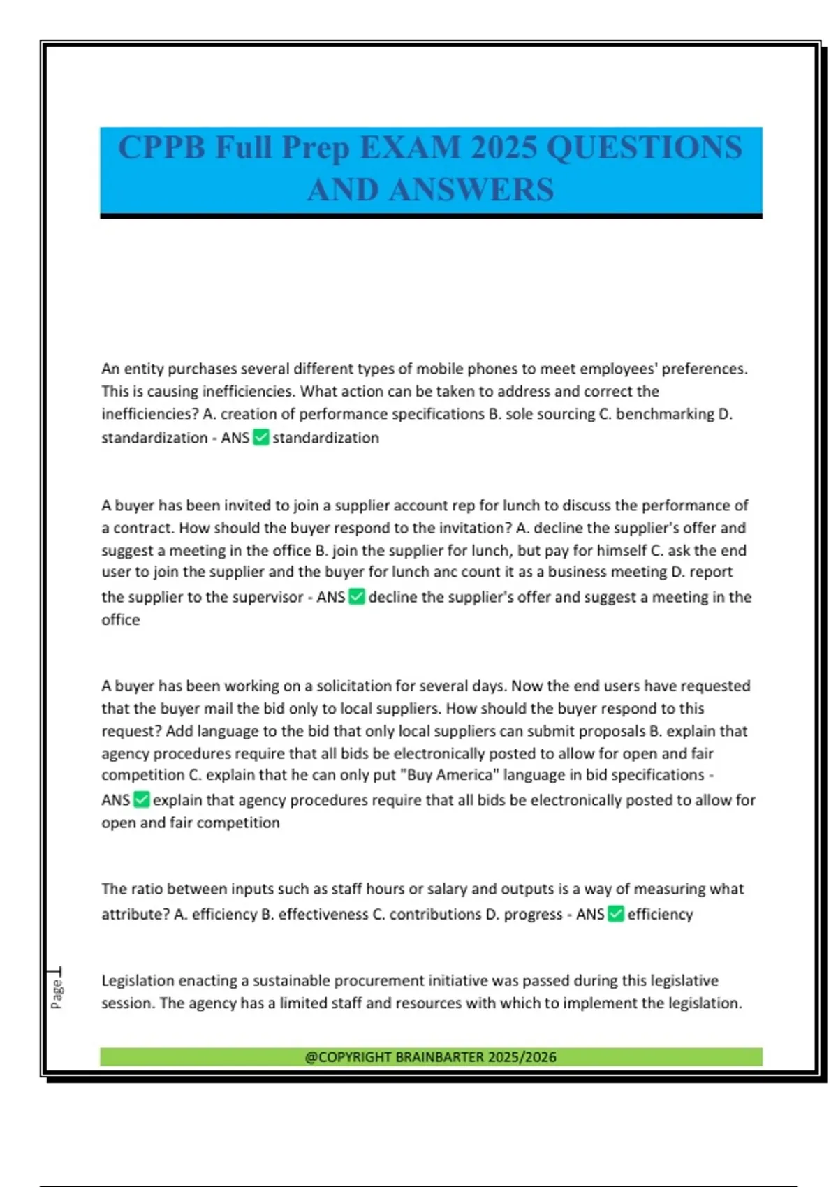 An entity purchases several different types of mobile phones to meet employees' preferences. This is causing inefficiencies. What action can be taken to address and correct the inefficiencies? A. creation of performance specifications B. sole sourcing C. benchmarking D. standardization - ANS standardization A buyer has been invited to join a supplier account rep for lunch to discuss the performance of a contract. How should the buyer respond to the invitation? A. decline the supplier's offer and suggest a meeting in the office B. join the supplier for lunch, but pay for himself C. ask the end user to join the supplier and the buyer for lunch anc count it as a business meeting D. report the supplier to the supervisor - ANS decline the supplier's offer and suggest a meeting in the office A buyer has been working on a solicitation for several days. Now the end users have requested that the buyer mail the bid only to local suppliers. How should the buyer respond to this request? Add language to the bid that only local suppliers can submit proposals B. explain that agency procedures require that all bids be electronically posted to allow for open and fair competition C. explain that he can only put "Buy America" language in bid specifications - ANS explain that agency procedures require that all bids be electronically posted to allow for open and fair competition The ratio between inputs such as staff hours or salary and outputs is a way of measuring what attribute? A. efficiency B. effectiveness C. contributions D. progress - ANS efficiency Legislation enacting a sustainable procurement initiative was passed during this legislative session. The agency has a limited staff and resources with which to implement the legislation. @COPYRIGHT BRAINBARTER 2025/2026 Page2 What type of program would be most easily implemented? A. alternative fuel vehicles B. energy efficient equipment C. recycled paper D. comprehensive recycling program - ANS recycled paper At an entity hosted small business educational and outreach workshop, the entity small business program coordinator noticed that only a few suppliers are actively participating in asking questions and discussion. In reaction, she works diligently to engage other suppliers who are not contributing. What role is she assuming? A. encourager B. observer C. information seeker D. gate keeper - ANS gate keeper The city's IT dept has a need to purchase 20 copies of a how-to-use over-the-counter software book for various user departments within the agency. The book is commonly available and it is estimated that the total cost would be $900, which is below the established bid threshold. The buyer has confirmed that the book is not currently on any agency contracts. Which type of purchase is considered most economical in this case? A. emergency B. sole source C. pcard D. invitation for bids - ANS pcard A buyer wishes to enter into a cooperative purchase with a regional alliance that could save a great deal of money. What is the buyer's first step? A. Determine if there is legal authority to do this B. Determine if the cost is advantageous C. Determine if local suppliers are impacted D. Determine if your terms and conditions are in compliance - ANS determine if there is legal authority to do this While on vacation the Chief Procurement Officer left a Procurement Manager in charge of operations via an interoffice memo. The Procurement Manager was faced with an emergency purchase that needed signature for $50K. What gives him the authority to sign for this emergency purchase? A. apparent authority B. express authority C. the Procurement Manager has authority to sign because it is an emergency purchase D. implied authority - ANS express authority An agency with a local small business preference program is accepting bids for a roofing project. Only Company C is in the local jurisdiction. Businesses located outside the local jurisdiction will have 5% of the bid amount added to their total bid amount. Company A bids $49,300. Company B bids $49,150. Company C bids $51,650. Company D bids $51,640. Which company should receive the award based on total low bid? - ANS B $49,150 @COPYRIGHT BRAINBARTER 2025/2026 Page3 When all mandatory requirements of a bid are met, what is the value of competitive quotes and competitive sealed bids? A. drives a decision based on price B. provides evaluation guidelines on which to base the award C. provides a reliable indicator of a robust supplier market D. it has no value - ANS drives a decision based on price What is the purpose of a cost analysis? A. compares each price quoted the entity as a result of the bid process B. an attempt to protect reasonable cost in a cost benefit analysis C. helps determine the supplier's costs actually incurred for the nonstandard items D. helps determine functional requirements at the lowest possible cost without impacting need and suitability - ANS helps determine the supplier's costs actually incurred for the nonstandard items The Sherriff's Dept is planning on acquiring a scanner to be used on work release inmates entering and leaving the jail. The scanner will have a lifespan of 10 years. The price for the scanner is $11,000. Maintenance must be performed on this machine monthly to ensure accuracy. Monthly maintenance will be $150. What is the life cycle cost for this entire purchase? A. $11,000 B. $29,000 C. $18,000 D. $36,000 - ANS $29,000 Dept of Water Resources is preparing a bid document for a new and complex composite water meter. What action should the buyer take to better ensure responsive bids? A. use brand name or equivalent specifications B. determine the industry standards for meter suppliers C. determine the life cycle cost of the meter D. schedule a pre-bid conference - ANS schedule a pre-bid conference An agency is deciding whether to purchase new or used riding mowers. What is the most appropriate analysis method to use to make this decision? A. historical price analysis B. life cycl