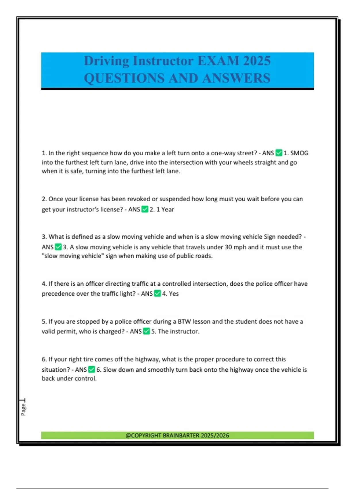 1. In the right sequence how do you make a left turn onto a one-way street? - ANS 1. SMOG into the furthest left turn lane, drive into the intersection with your wheels straight and go when it is safe, turning into the furthest left lane. 2. Once your license has been revoked or suspended how long must you wait before you can get your instructor's license? - ANS 2. 1 Year 3. What is defined as a slow moving vehicle and when is a slow moving vehicle Sign needed? - ANS 3. A slow moving vehicle is any vehicle that travels under 30 mph and it must use the "slow moving vehicle" sign when making use of public roads. 4. If there is an officer directing traffic at a controlled intersection, does the police officer have precedence over the traffic light? - ANS 4. Yes 5. If you are stopped by a police officer during a BTW lesson and the student does not have a valid permit, who is charged? - ANS 5. The instructor. 6. If your right tire comes off the highway, what is the proper procedure to correct this situation? - ANS 6. Slow down and smoothly turn back onto the highway once the vehicle is back under control. @COPYRIGHT BRAINBARTER 2025/2026 Page2 7. What is the required equipment you must have in a driver's education vehicle? - ANS 7. A passenger side brake and a passenger side rear view mirror. Also a sign on the back of the vehicle stating it is a drivers education vehicle. 8. How many feet must your taillights be visible from the rear? - ANS 8. 500 feet. 9. There are the only items you can have on your windshield of a motor vehicle, name them. - ANS 9. State Park. National Park, Parking lot and safety inspection stickers & MN Pass Collections device. 10. When is the only time you do not have to stop for a school bus when the arm is down and the lights are flashing? - ANS 10.When you are on the other side ofa divided highway. 11. During classroom instruction, how much break time is allowed per hour of class? - ANS 11. Zero. 12. Name three information signs and give their colors and give their meanings. - ANS 12.Red — prohibits and commands, Yellow — warning, Yellow-Green — Warns in school and bike zones, Orange —~ Construction. White — Regulates, Green — Guides and Informs, Blue — Motorist Services, Brown — Historical, Cultural and Recreational. 13. What is the Implied Consent Law? - ANS 13.You must give a breath test when requested by a police officer, or you will lose your license for a year. 14. When and where would you see a solid double white line and what is its purpose? - ANS 14.When traffic is moving in the same direction. It is meant to keep people from changing lanes