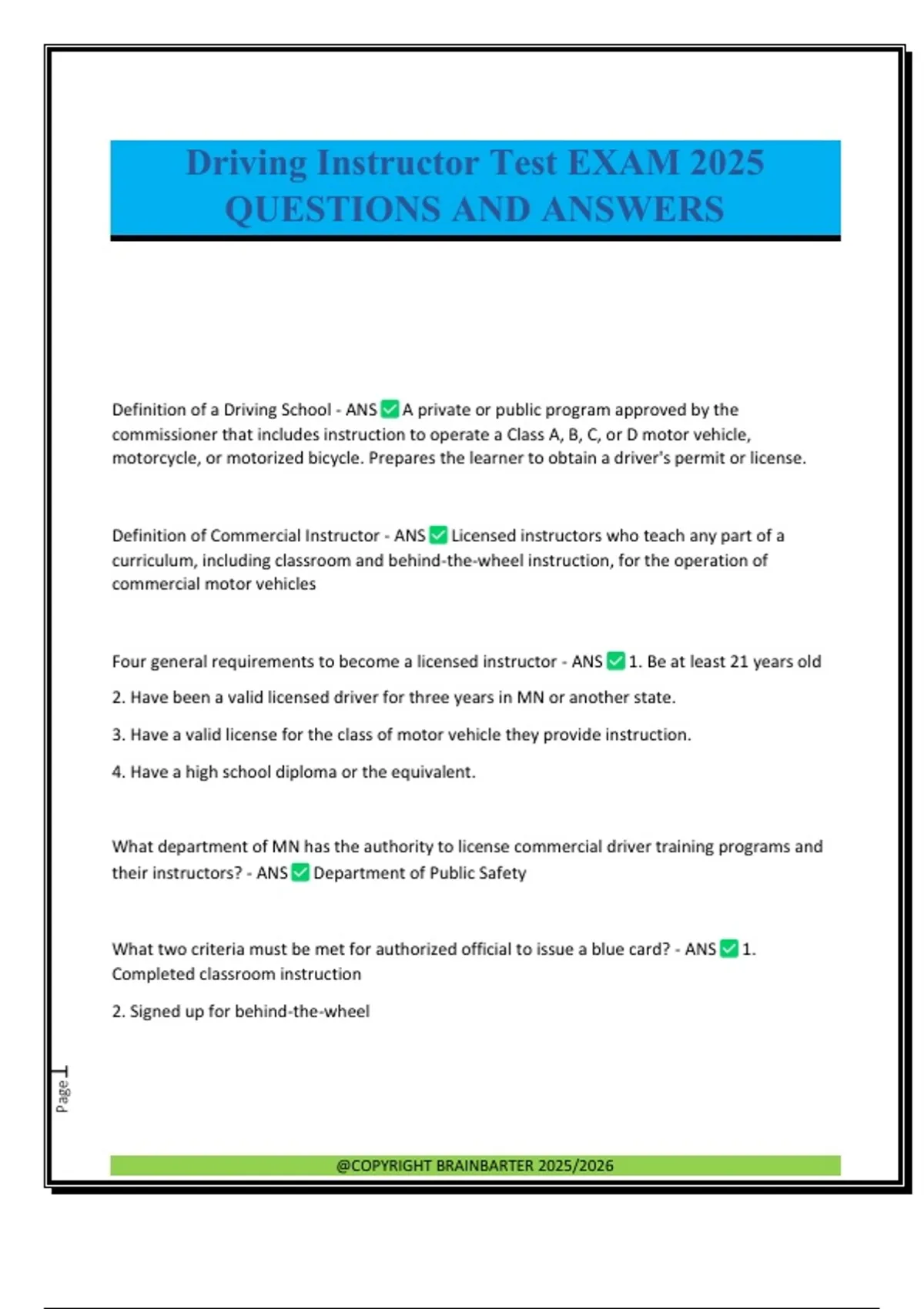 Definition of a Driving School - ANS A private or public program approved by the commissioner that includes instruction to operate a Class A, B, C, or D motor vehicle, motorcycle, or motorized bicycle. Prepares the learner to obtain a driver's permit or license. Definition of Commercial Instructor - ANS Licensed instructors who teach any part of a curriculum, including classroom and behind-the-wheel instruction, for the operation of commercial motor vehicles Four general requirements to become a licensed instructor - ANS 1. Be at least 21 years old 2. Have been a valid licensed driver for three years in MN or another state. 3. Have a valid license for the class of motor vehicle they provide instruction. 4. Have a high school diploma or the equivalent. What department of MN has the authority to license commercial driver training programs and their instructors? - ANS Department of Public Safety What two criteria must be met for authorized official to issue a blue card? - ANS 1. Completed classroom instruction 2. Signed up for behind-the-wheel @COPYRIGHT BRAINBARTER 2025/2026 Page2 What is the maximum amount of classroom instruction that can be given in one day? - ANS No more than 3 hours a day for someone under 18 without a driver's license. When is a letter of completion sent out? - ANS Within 15 days after the student completes the classroom portion. What directions should be sent to students? - ANS Show your "blue card" when applying for instruction permit and the written test. At this point you need to be at least 15, be enrolled in the behind-the-wheel component of driver's ed, pass a vision test, and pass a written knowledge test. What two licenses must an instructor possess while giving a behind the wheel lesson? - ANS 1. A current and valid driver's license 2. Instructor's license What three documents does a student under 18 need to take the knowledge test? - ANS 1. Primary form of identification (Birth Certificate/Passport) 2. Secondary form of identification (School transcript/School ID card) 3. Blue Card If a student fails to complete behind the wheel instruction, when should the official of the driving school notify the commissioner of this? - ANS Within 15 days What are the consequences for a student who does not complete behind the wheel? - ANS They can't get their license until they are 18. What can be used a