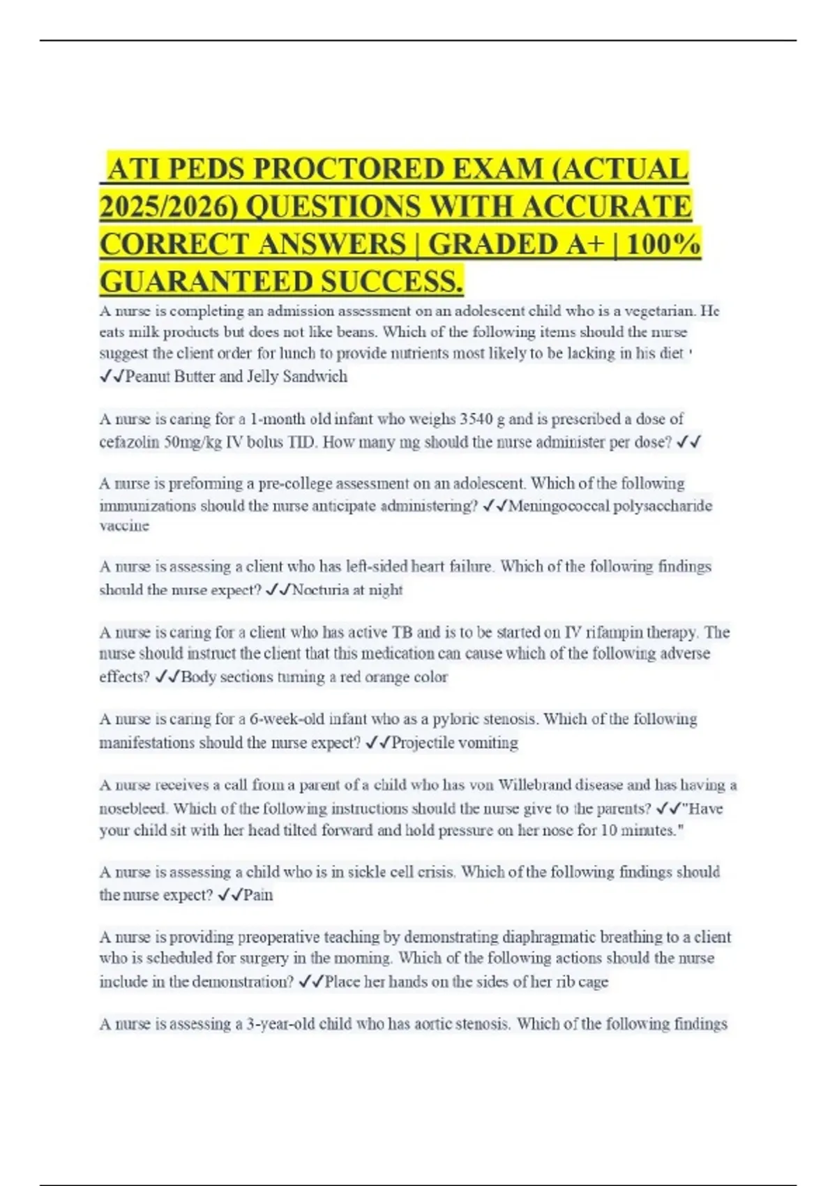 ATI PEDS PROCTORED EXAM (ACTUAL 2025/2026) QUESTIONS WITH ACCURATE CORRECT ANSWERS | GRADED A+ | 100% GUARANTEED SUCCESS.