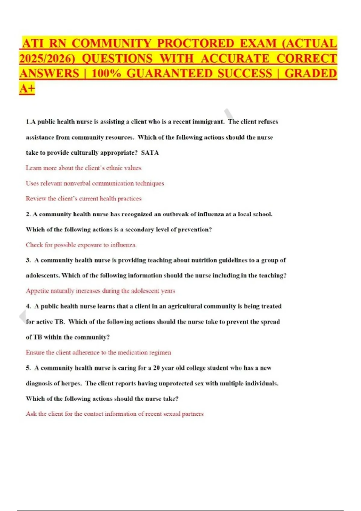 ATI RN COMMUNITY PROCTORED EXAM (ACTUAL 2025/2026) QUESTIONS WITH ACCURATE CORRECT ANSWERS | 100% GUARANTEED SUCCESS | GRADED A+