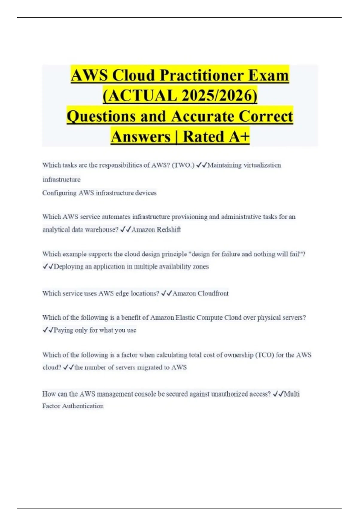 AWS Cloud Practitioner Exam (ACTUAL 2025/2026) Questions and Accurate Correct Answers | Rated A+ Which tasks are the responsibilities of AWS? (TWO.) Maintaining virtualization infrastructure Configuring AWS infrastructure devices Which AWS service automates infrastructure provisioning and administrative tasks for an analytical data warehouse? Amazon Redshift Which example supports the cloud design principle "design for failure and nothing will fail"? Deploying an application in multiple availability zones Which service uses AWS edge locations? Amazon Cloudfront