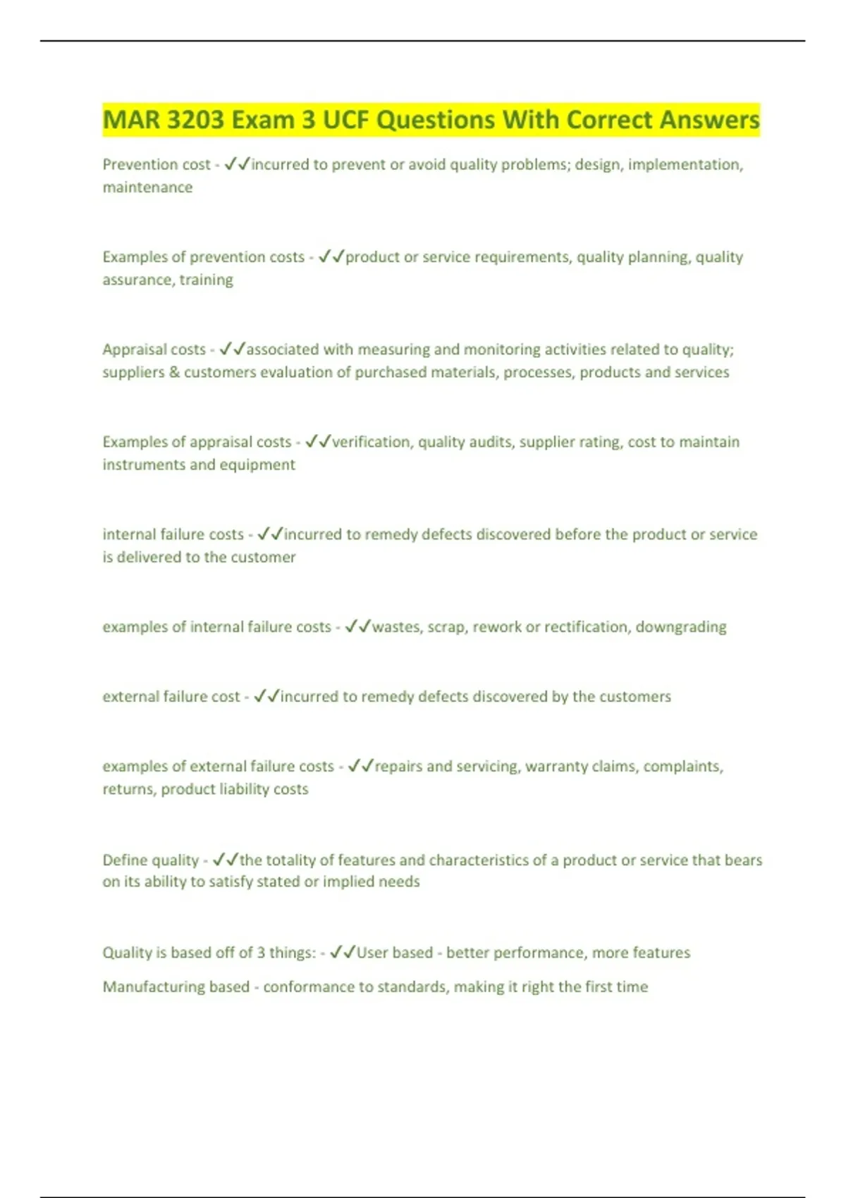 Appraisal costs - ✔✔associated with measuring and monitoring activities related to quality;