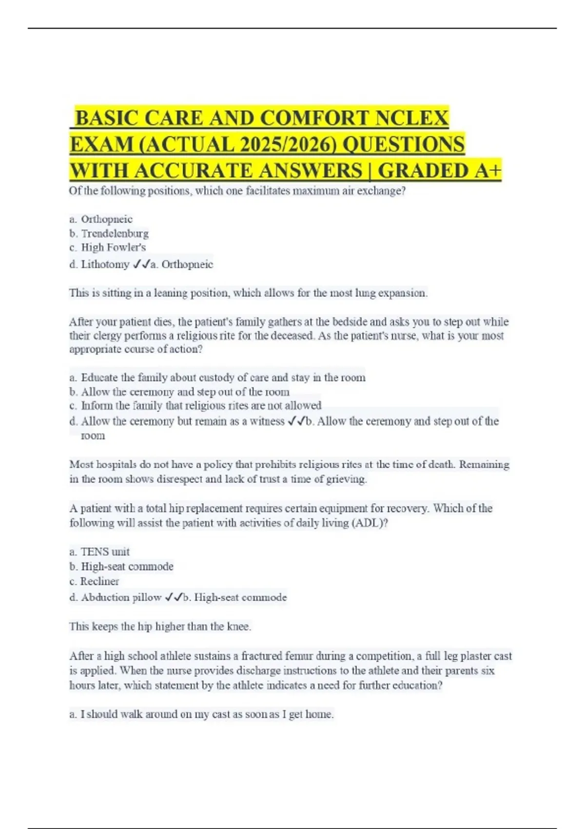BASIC CARE AND COMFORT NCLEX EXAM (ACTUAL 2025/2026) QUESTIONS WITH ACCURATE ANSWERS | GRADED A+ Of the following positions, which one facilitates maximum air exchange? a. Orthopneic b. Trendelenburg c. High Fowler's d. Lithotomy a. Orthopneic This is sitting in a leaning position, which allows for the most lung expansion. After your patient dies, the patient's family gathers at the bedside and asks you to step out while their clergy performs a religious rite for the deceased. As the patient's nurse, what is your most appropriate course of action? a. Educate the family about custody of care and stay in the room b. Allow the ceremony and step out of the room c. Inform the family that religious rites are not allowed d. Allow the ceremony but remain as a witness b. Allow the ceremony and step out of the room
