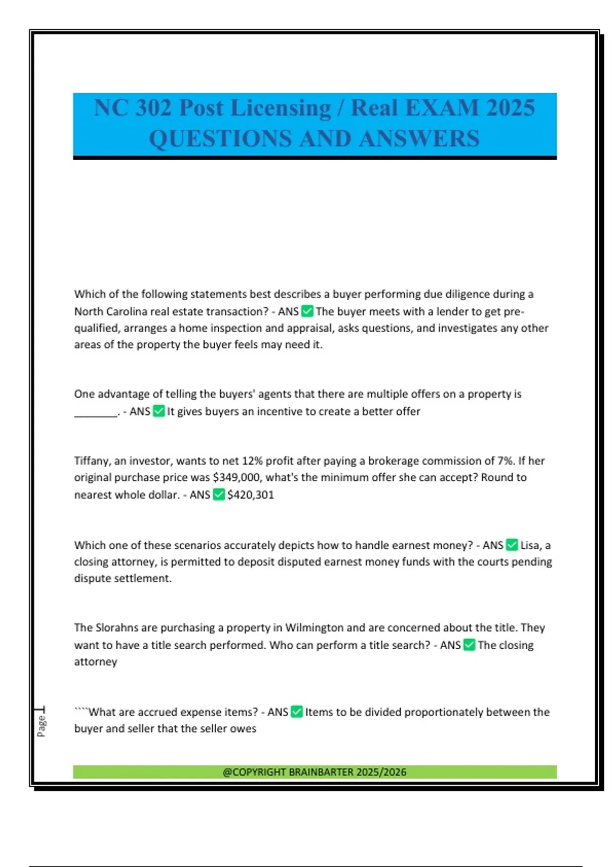 Which of the following statements best describes a buyer performing due diligence during a North Carolina real estate transaction? - ANS The buyer meets with a lender to get pre- qualified, arranges a home inspection and appraisal, asks questions, and investigates any other areas of the property the buyer feels may need it. One advantage of telling the buyers' agents that there are multiple offers on a property is _______. - ANS It gives buyers an incentive to create a better offer Tiffany, an investor, wants to net 12% profit after paying a brokerage commission of 7%. If her original purchase price was $349,000, what's the minimum offer she can accept? Round to nearest whole dollar. - ANS $420,301 Which one of these scenarios accurately depicts how to handle earnest money? - ANS Lisa, a closing attorney, is permitted to deposit disputed earnest money funds with the courts pending dispute settlement. The Slorahns are purchasing a property in Wilmington and are concerned about the title. They want to have a title search performed. Who can perform a title search? - ANS The closing attorney ````What are accrued expense items? - ANS Items to be divided proportionately between the buyer and seller that the seller owes @COPYRIGHT BRAINBARTER 2025/2026 Page2 Which of the following actions is a North Carolina broker who's acting as an agent in a transaction permitted to do? - ANS Complete a pre-printed offer when directed to do so by the transaction parties. `````The Back-Up Addendum should be used when ______. - ANS The seller wants to accept a secondary offer North Carolina licensee Tara is completing the Offer to Purchase and Contract, Standard Form 2-T, for her married buyer clients Bob and Maggie McKenzie, who are listed in LinkedIn and Facebook as Robert "Bobby Mack" McKenzie and Margaret (née Harper) McKenzie. Their legal names are Robert H. McKenzie and Margaret E. McKenzie. How should Tara list their names in the contract? - ANS Robert H. McKenzie and wife, Margaret E. McKenzie North Carolina buyer Travis needed to obtain a mortgage loan to purchase another property that's under contract. Which of these statements applies in this situation? - ANS The Loan paragraph in Standard Form 12-T notes the buyer is entitled to apply for a mortgage loan. This paragraph is NOT a contingency. If Travis isn't approved and doesn't find that out until after the due diligence period expires, he'll lose his earnest *The Loan paragraph in Standard Form 12-T notes that the buyer is entitled to apply for and seek approval for a loan. The buyer's obligation to purchase the property is NOT contingent on obtaining a loan. The buyer should work with the lender to try to determine whether it's likely the buyer will be approved for the loan before the due diligence period expires. If the buyer isn't approved before the expiration, the buyer may terminate the contract and have the earnest money returned. ______ lending was a contributing factor to the housing collapse in the mid-2000s - ANS Predatory If the property tax proration is $4.50 per day, the settlement date is March 13, the buyer and seller have not negotiate