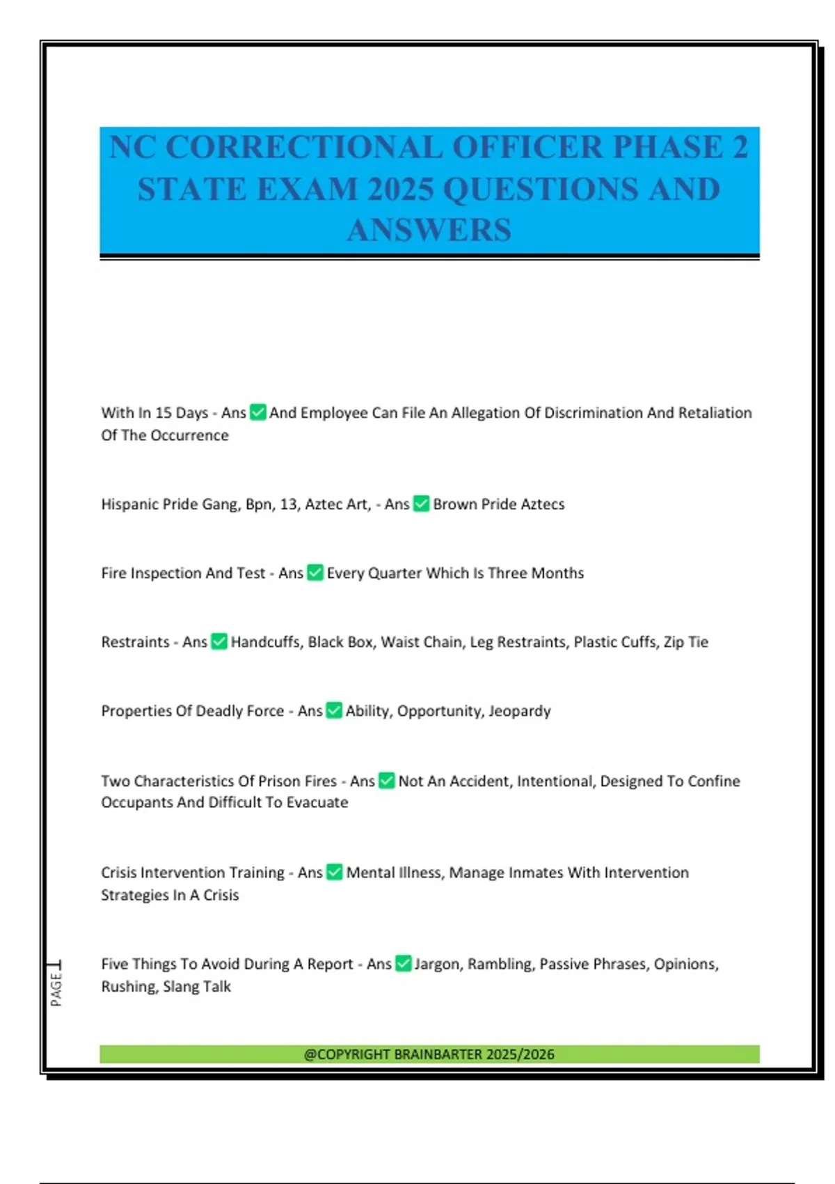 With In 15 Days - Ans And Employee Can File An Allegation Of Discrimination And Retaliation Of The Occurrence Hispanic Pride Gang, Bpn, 13, Aztec Art, - Ans Brown Pride Aztecs Fire Inspection And Test - Ans Every Quarter Which Is Three Months Restraints - Ans Handcuffs, Black Box, Waist Chain, Leg Restraints, Plastic Cuffs, Zip Tie Properties Of Deadly Force - Ans Ability, Opportunity, Jeopardy Two Characteristics Of Prison Fires - Ans Not An Accident, Intentional, Designed To Confine Occupants And Difficult To Evacuate Crisis Intervention Training - Ans Mental Illness, Manage Inmates With Intervention Strategies In A Crisis Five Things To Avoid During A Report - Ans Jargon, Rambling, Passive Phrases, Opinions, Rushing, Slang Talk @COPYRIGHT BRAINBARTER 2025/2026 PAGE2 Prison Emergency - Ans Prison Climate Awareness, Security Practices, Staff Professionalism, Preparedness, Prevention This Method Explain Custodial Procedures - Ans Prevent Escape, Prevent Assaults, Practice Methods To Maintain Control, Practice Methods To Maintain Custody, And Other Harmful Illegal Acts Inmates Psychomotor - Ans Physical Behavior-Things We Do Conditions Of Sexual Harassment - Ans Unreasonable Interfering With An Individual Work Performance Creating Intimidation Hostile Or Offensive Work Environment Therapeutic Diversion Unit - Ans Program That Gave Staff Decreased Assaults In Safety Certification Three Constitutional Rights - Ans Eighth Amendment (Meds) ,First Amendment, 14th Amendment Malditos 13 Gang - Ans Wicked Ones, Mexican Mafia, Blue Color Certified Armor Officer - Ans Can A Disassemble A Firearm By Special Training In Qualification Basic Principle Of Fire Fighting -