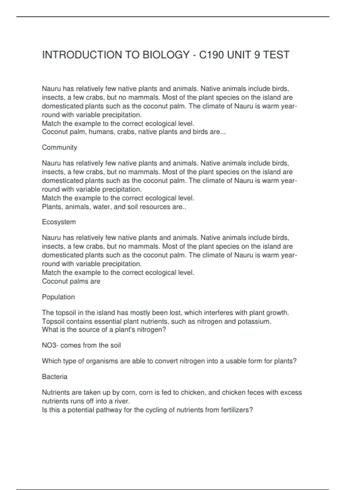 INTRODUCTION TO BIOLOGY - C190 UNIT 9 TEST