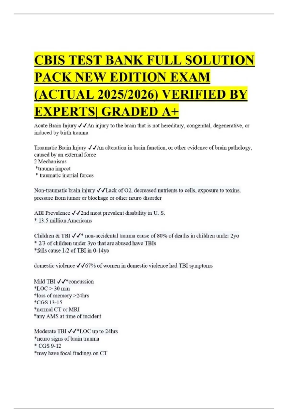CBIS TEST BANK FULL SOLUTION PACK NEW EDITION EXAM (ACTUAL 2025/2026) VERIFIED BY EXPERTS| GRADED A+ Acute Brain Injury An injury to the brain that is not hereditary, congenital, degenerative, or induced by birth trauma Traumatic Brain Injury An alteration in brain function, or other evidence of brain pathology, caused by an external force 2 Mechanisms *trauma impact * traumatic inertial forces Non-traumatic brain injury Lack of O2, decreased nutrients to cells, exposure to toxins, pressure from tumor or blockage or other neuro disorder ABI Prevalence 2nd most prevalent disability in U. S. * 13.5 million Americans Children & TBI * non-accidental trauma cause of 80% of deaths in children under 2yo * 2/3 of children under 3yo that are abused have TBIs *falls cause 1/2 of TBI in 0-14yo domestic violence 67% of women in domestic violence had TBI symptoms Mild TBI *concussion *LOC > 30 min *loss of memory >24hrs *CGS 13-15 *normal CT or MRI *any AMS at time of incident Moderate TBI *LOC up to 24hrs *neuro signs of brain trauma * CGS 9-12 *may have focal findings on CT