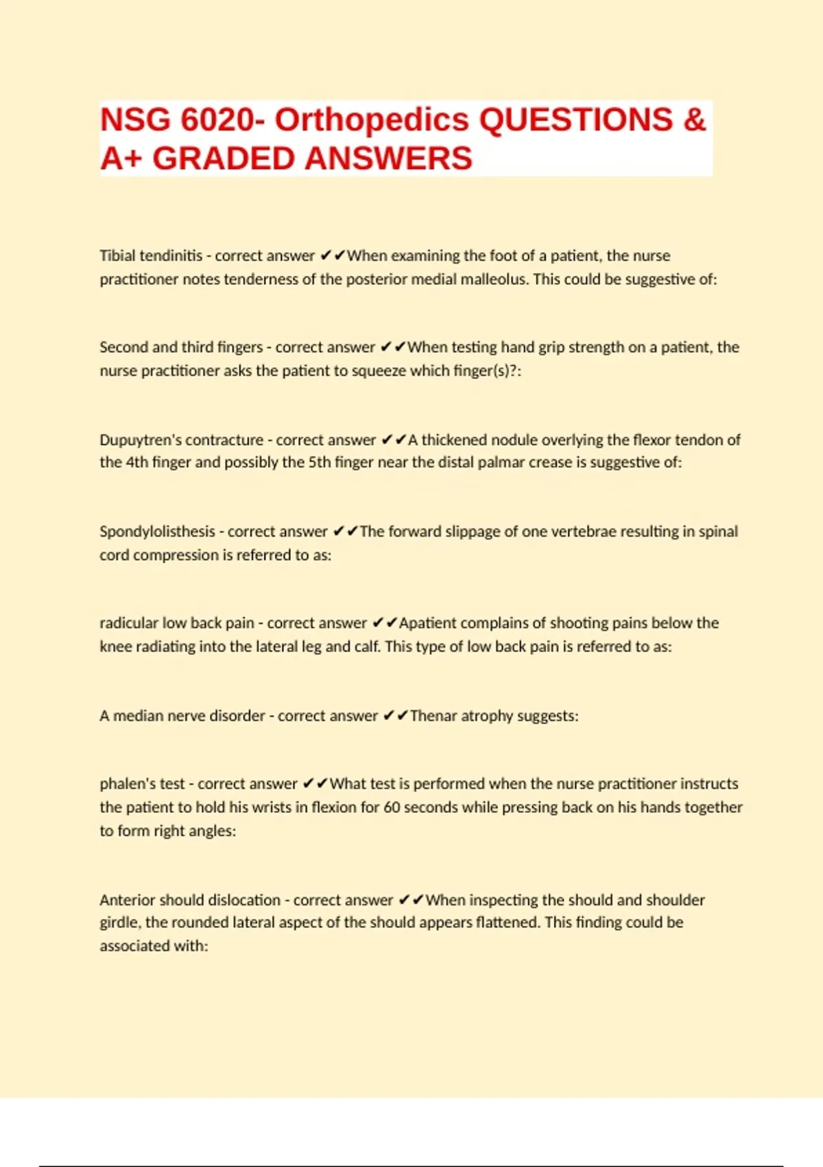 NSG 6020- Orthopedics QUESTIONS & A+ GRADED ANSWERS Tibial tendinitis - correct answer When examining the foot of a patient, the nurse practitioner notes tenderness of the posterior medial malleolus. This could be suggestive of: Second and third fingers - correct answer When testing hand grip strength on a patient, the nurse practitioner asks the patient to squeeze which finger(s)?: Dupuytren's contracture - correct answer A thickened nodule overlying the flexor tendon of the 4th finger and possibly the 5th finger near the distal palmar crease is suggestive of: Spondylolisthesis - correct answer The forward slippage of one vertebrae resulting in spinal cord compression is referred to as: