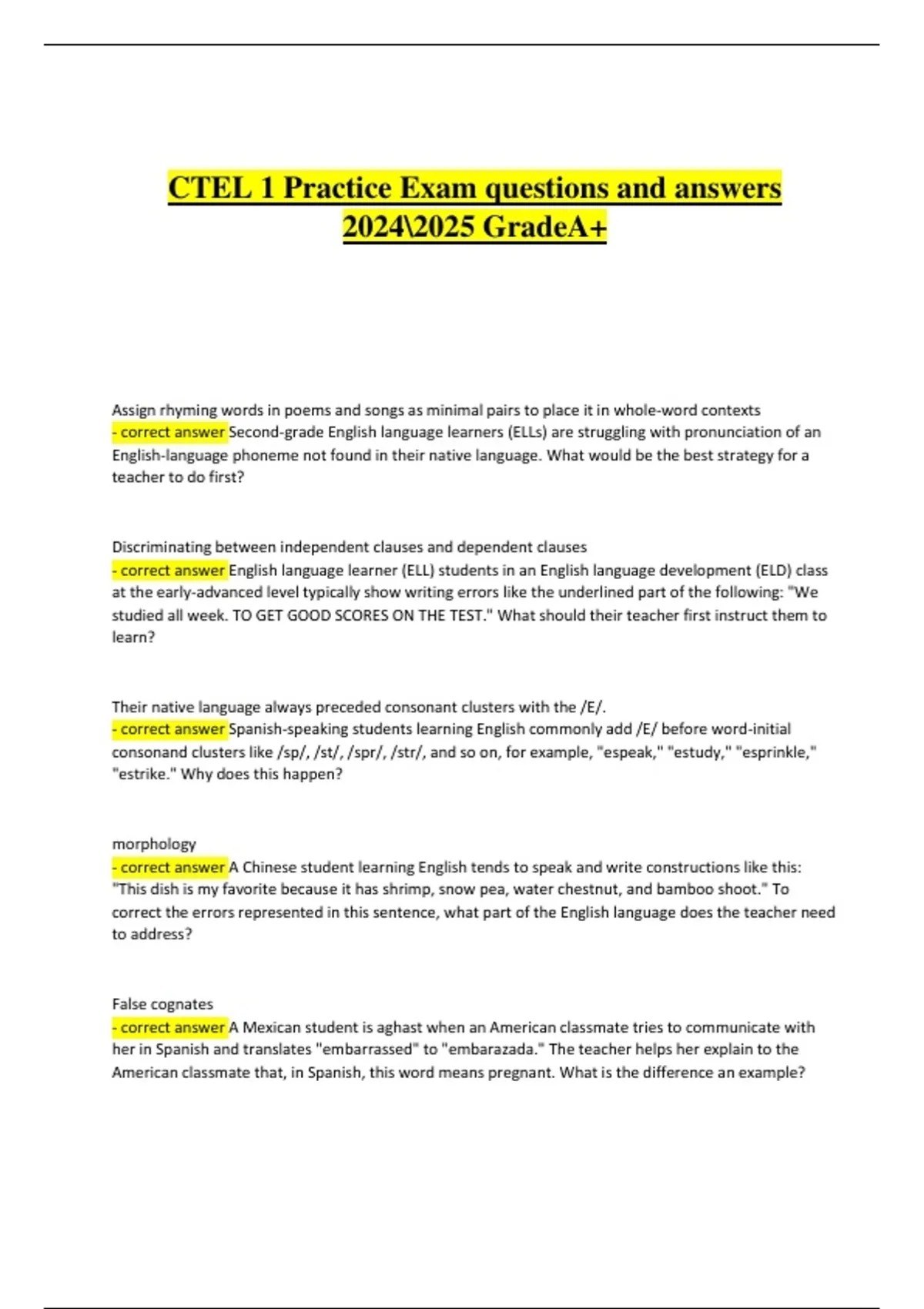 CTEL 1 Practice Exam Questions and Answers 2024/2025 | Grade A+ Study Material
