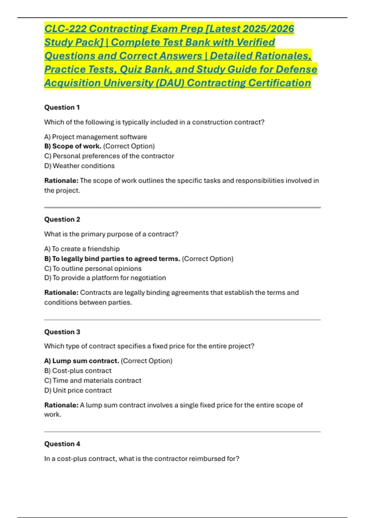 Rationale: A cost-plus contract reimburses the contractor for actual costs incurred