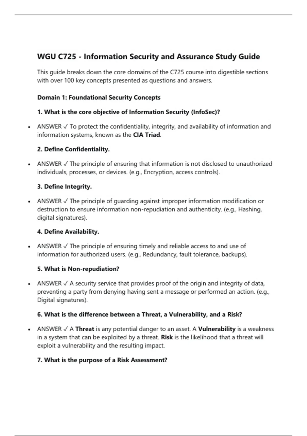 WGU C725 - Information Security and Assurance Study Guide This guide breaks down the core domains of the C725 course into digestible sections with over 100 key concepts presented as questions and answers. Domain 1: Foundational Security Concepts 1. What is the core objective of Information Security (InfoSec)?  ANSWER To protect the confidentiality, integrity, and availability of information and information systems, known as the CIA Triad. 2. Define Confidentiality.  ANSWER The principle of ensuring that information is not disclosed to unauthorized individuals, processes, or devices. (e.g., Encryption, access controls). 3. Define Integrity.  ANSWER The principle of guarding against improper information modification or destruction to ensure information non-repudiation and authenticity. (e.g., Hashing, digital signatures). 4. Define Availability.  ANSWER The principle of ensuring timely and reliable access to and use of information for authorized users. (e.g., Redundancy, fault tolerance, backups). 5. What is Non-repudiation?  ANSWER A security service that provides proof of the origin and integrity of data, preventing a party from denying having sent a message or performed an action. (e.g., Digital signatures). 6. What is the difference between a Threat, a Vulnerability, and a Risk?  ANSWER A Threat is any potential danger to an asset. A Vulnerability is a weakness in a system that can be exploited by a threat. Risk is the likelihood that a threat will exploit a vulnerability and the resulting impact. 7. What is the purpose of a Risk Assessment?  ANSWER To identify, estimate, and prioritize risks to organizational operations, assets, and individuals. 8. What are the four common Risk Response strategies?  ANSWER Acceptance (acknowledge the risk), Avoidance (stop the activity causing the risk), Mitigation (implement controls to reduce the risk), Transference (shift the risk to a third party, e.g., insurance). 9. What is the principle of Least Privilege?  ANSWER Granting users only the minimum levels of access—or permissions— necessary to perform their job functions. 10. What is Defense in Depth (Layered Defense)?  ANSWER A security strategy that employs multiple, layered defensive mechanisms to protect assets. If one mechanism fails, another steps up. (e.g., Firewall, IPS, antivirus, user training).