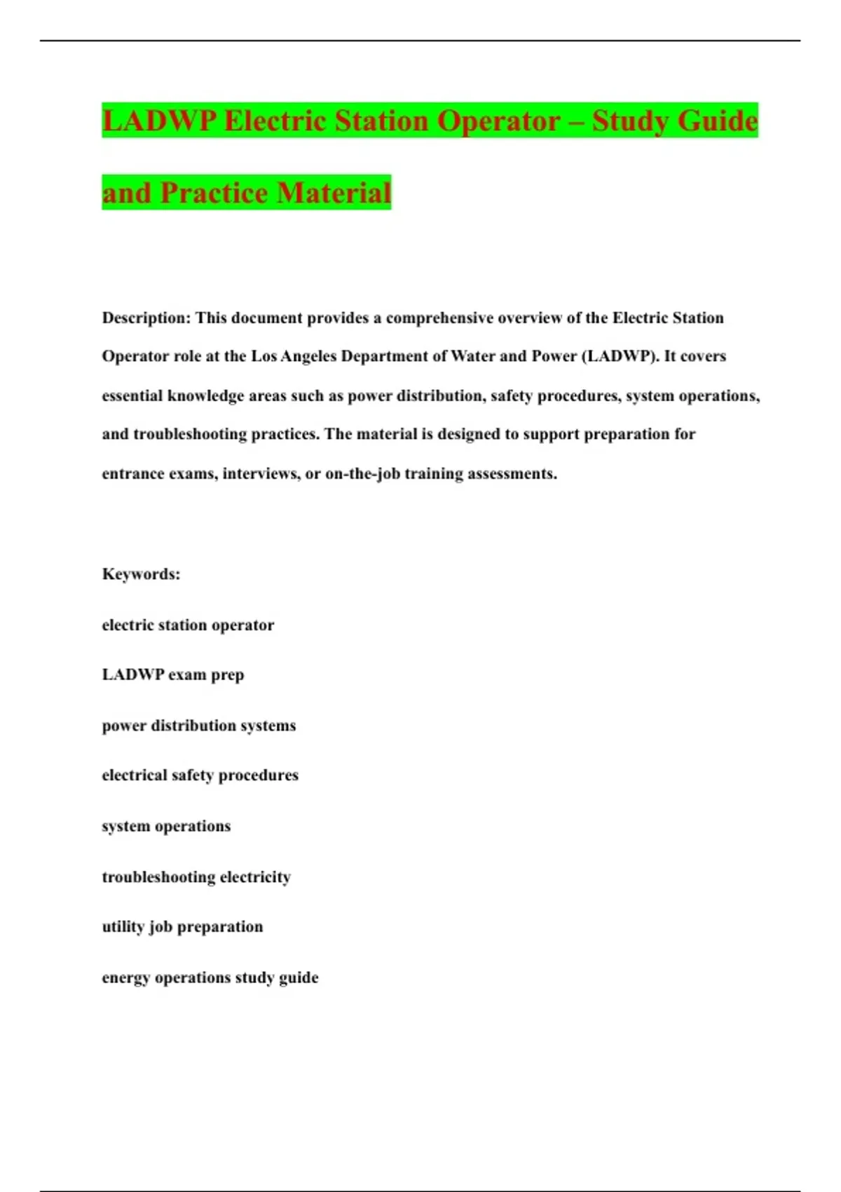 LADWP Electric Station Operator – Study Guide and Practice Material Description: This document provides a comprehensive overview of the Electric Station Operator role at the Los Angeles Department of Water and Power (LADWP). It covers essential knowledge areas such as power distribution, safety procedures, system operations, and troubleshooting practices. The material is designed to support preparation for entrance exams, interviews, or on-the-job training assessments. Keywords: electric station operator LADWP exam prep power distribution systems electrical safety procedures system operations troubleshooting electricity utility job preparation energy operations study guide Q: What is the primary responsibility of an LADWP Electric Station Operator? A: Their primary responsibility is to safely and efficiently monitor, control, and maintain the electrical power system, including generation plants, substations, and transmission lines, to ensure a reliable supply of electricity to Los Angeles. Q: What key systems does an operator monitor from the control center? A: They monitor the Energy Management System (EMS), the Supervisory Control and Data Acquisition (SCADA) system, and other real-time tools that display grid status, voltage levels, power flows, and equipment status. Q: Name one critical daily task for an operator beyond monitoring screens. A: Executing switching orders to safely isolate equipment for maintenance or to reconfigure the grid for reliability, all while following strict safety protocols. Knowledge and Skills Q: What fundamental electrical concepts must an operator understand? A: They must have a deep understanding of AC/DC power systems, voltage regulation, power factor, load-frequency control, and the relationships between volts, amps, watts, and vars. Q: Why is knowledge of NERC reliability standards crucial for this role? A: Because NERC standards are mandatory regulations to ensure the reliability and security of the bulk power system. Compliance is legally required to prevent blackouts and maintain grid security. Q: What is a "one-line diagram" and why is it important? A: A one-line diagram is a simplified schematic drawing that represents the electrical system using single lines and standardized symbols. It is vital for understanding system configuration, planning switching procedures, and responding to emergencies.