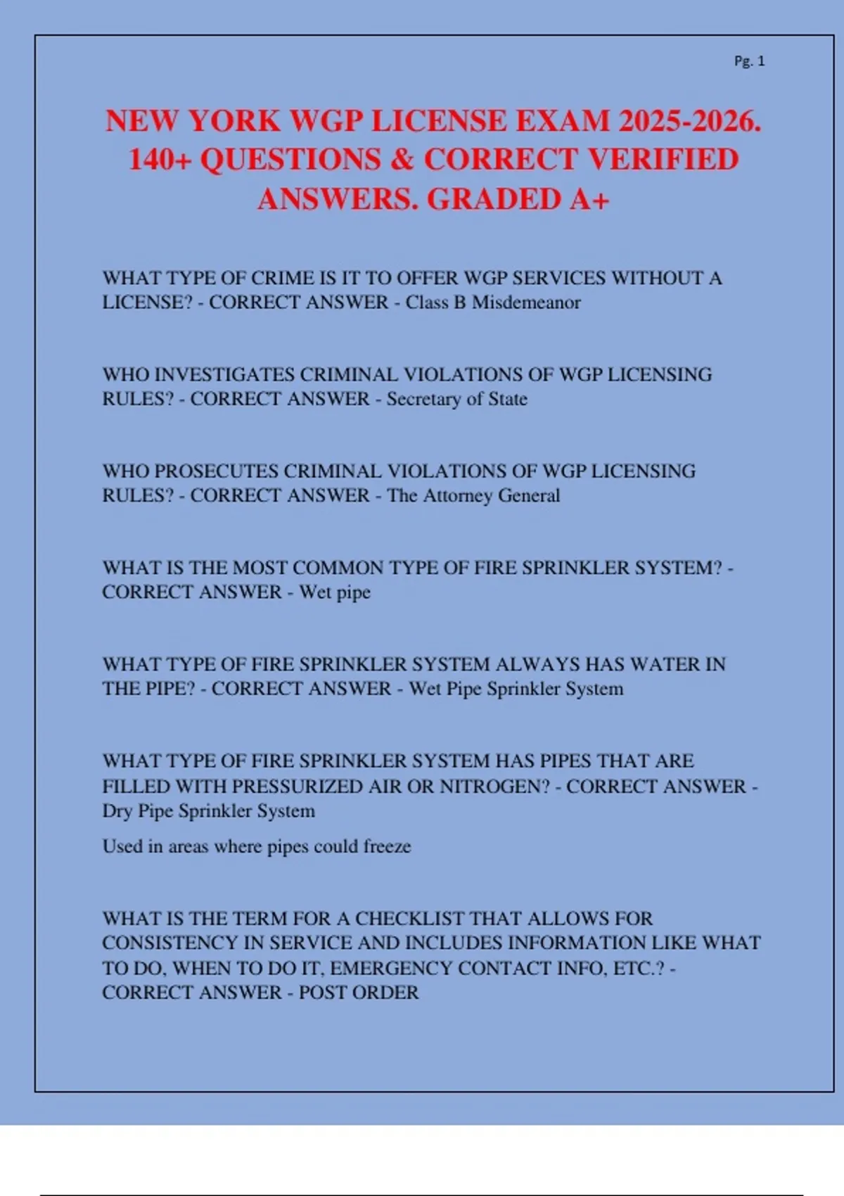 This document contains over 140 practice questions with correct and verified answers for the New York Watch Guard Patrol (WGP) License Exam (2025–2026). It covers essential topics including licensing laws, penalties, training requirements, fire safety systems, incident reporting, contracts, insurance, counter-terrorism measures, and employment regulations. Questions also address criminal law classifications, workplace safety, and administrative procedures, making it a complete preparation resource for candidates seeking WGP certification.