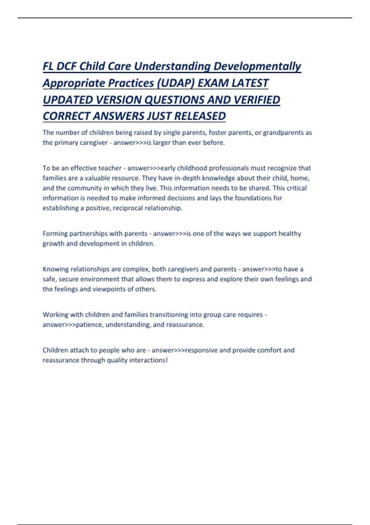 This document provides the most recent updated version of the Florida DCF Child Care Understanding Developmentally Appropriate Practices (UDAP) Exam with verified correct answers. It covers essential child care principles including developmental milestones, learning through play, guiding behavior, creating supportive learning environments, family engagement, cultural responsiveness, and Florida-specific child care regulations. Designed to meet Florida Department of Children and Families (DCF) training requirements, this resource is an excellent study tool for child care providers preparing for the UDAP exam