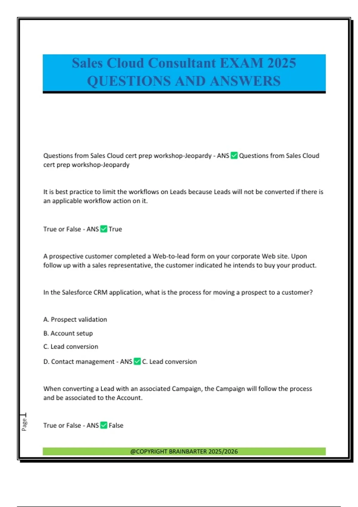 Questions from Sales Cloud cert prep workshop-Jeopardy - ANS Questions from Sales Cloud cert prep workshop-Jeopardy It is best practice to limit the workflows on Leads because Leads will not be converted if there is an applicable workflow action on it. True or False - ANS True A prospective customer completed a Web-to-lead form on your corporate Web site. Upon follow up with a sales representative, the customer indicated he intends to buy your product. In the Salesforce CRM application, what is the process for moving a prospect to a customer? A. Prospect validation B. Account setup C. Lead conversion D. Contact management - ANS C. Lead conversion When converting a Lead with an associated Campaign, the Campaign will follow the process and be associated to the Account. True or False - ANS False @COPYRIGHT BRAINBARTER 2025/2026 Page2 Marketing is excited to launch a new product, and wants to track related transactions. They requested an email be automatically sent to notify them. As a system administrator, you: A. Create a Dashboard for the Marketing group to review Opportunities by Product on a regular basis B. Create a workflow to send an email each time for Opportunities with that product C. Train them to leverage the new Global Search function D. Add a flag on the Opportunity identifying it for review - ANS B. Create a workflow to send an email each time for Opportunities with that product The marketing department would like to determine earlier in the lead hand-off process how effective their efforts are instead of looking only at the number of Closed/Won Opportunities tied to a campaign. Marketing owns the conversion of a lead. Which of the following is the best indicator of quality leads as deemed by the sales team? A. A report showing the upward trend of converted leads B. A dashboard depicting an increase in new contacts created C. A dashboard depicting an increase in new opportunities created D. A report showing an upward trend of non-rejected, converted leads - ANS D. A report showing an upward trend of non-rejected, converted leads Which metrics should you consider when building Marketing dashboards for your client manager? (Select the best 2) A. Ask for her opportunity escalation SLA B. Ask how lead scoring is calculated C. Understand her sales pipeline goals D. Define quality vs. quantity of leads E. Standardize campaign hierarchy - ANS B. Ask how lead scoring is calculated @COPYRIGHT BRAINBARTER 2025/2026 Page3 D. Define quality vs. quantity of leads You have completed the configuration of Salesforce CRM for your client. You have Leads that are clean and ready to be migrated into Salesforce CRM. What three steps should you consider prior to loading this data set? A. Activating historical users B. Suspend workflow rules C. Deactivate queues D. Define Data Loader mapping - ANS A. Activating historical users B. Suspend workflow rules D. Define Data Loader mapping If your Org Wide Default for Accounts is set to Private, adding someone to an Account Team with access of read/write will override the Org Wide Default. True or False - ANS TRUE As the System Administrator, you want to ensure that you are the only profile able to modify the Financial System ID field on the Account record. To best secure the field, you should: A. Use the page layout to make the field Read Only on the Page Layout B. Use field level security to make the field read only for all users except the System Administrator C. Create a validation rule to ensure that only the Profile of System Administrator can modify the field D. Create a Sharing rule so that only the System Administrator can view/edit the field - ANS B. Use field le