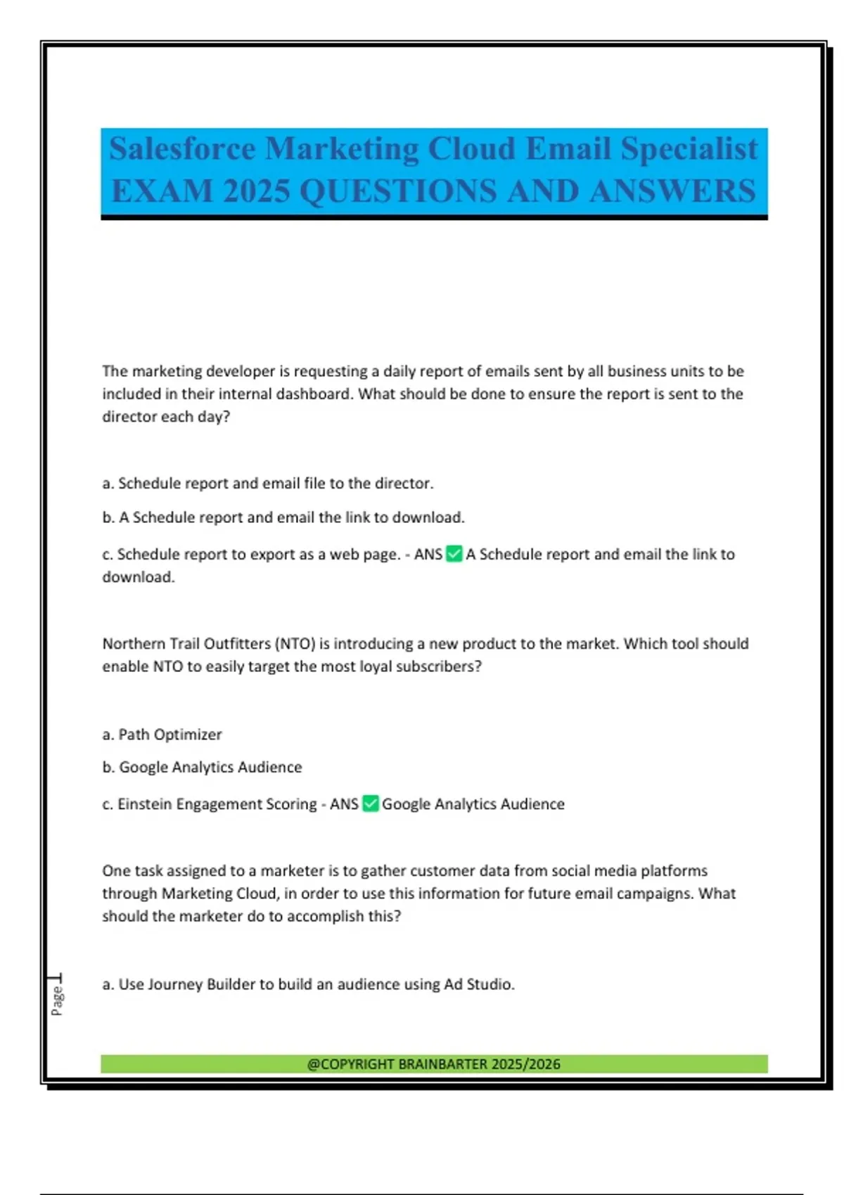 The marketing developer is requesting a daily report of emails sent by all business units to be included in their internal dashboard. What should be done to ensure the report is sent to the director each day? a. Schedule report and email file to the director. b. A Schedule report and email the link to download. c. Schedule report to export as a web page. - ANS A Schedule report and email the link to download. Northern Trail Outfitters (NTO) is introducing a new product to the market. Which tool should enable NTO to easily target the most loyal subscribers? a. Path Optimizer b. Google Analytics Audience c. Einstein Engagement Scoring - ANS Google Analytics Audience One task assigned to a marketer is to gather customer data from social media platforms through Marketing Cloud, in order to use this information for future email campaigns. What should the marketer do to accomplish this? a. Use Journey Builder to build an audience using Ad Studio. @COPYRIGHT BRAINBARTER 2025/2026 Page2 b. Web Studio to capture Query parameters from social media link. c. Use an interactive form from email Studio to collect this information - ANS Web Studio to capture Query parameters from social media link. Northern Trail Outfitters is regularly sending customer data to Marketing Cloud through daily batch files via file drops. However, when the Automation is executed, the files frequently contain no data, leaving important information unavailable for processing. Which component of Automation Studio ensures that steps within the Automation are only executed when a certain criteria is fulfilled? a. Verification Activity b. Skip Automation c. Wait Activity - ANS Verification Activity Northern Trail Outfitters (NTO) is starting a new campaign after purchases where customers are sent emails requesting feedback on their recent shopping experience. What should the NTO marketing team include in the email design to encourage a high response rate? a. Make the call-to-action button that links to the feedback form bigger and with red background b. Replace call-to-action with interactive Email Form c. A Salesforce Survey block called in by an AMPscript function. - ANS Replace call-to-action with interactive Email Form Northern Trail Outfitters brings in a protected document containing the preferred colors of its subscribers. Which automation activity and configuration setting should be used to import decrypted information to a data extension? a. Manage Files in File Transfer. b. Specify character encoding in import file. c. Configure Field-Level Encryption in import file. - ANS Manage Files in File Transfer. @COPYRIGHT BRAINBARTER 2025/2026 Page3 An employee in the digital marketing department at Northern Trail Outfitters (NTO) needs to promptly report the delivery rate of the latest email sent by the NTO business unit. Where should the Internal look to find this Information? a. Automation Studio > Activities b. Content Builder > Recent Sends c. Email Studio > Overview - ANS Email Studio > Overview Northern TV-ail Outfitters (NTO) intended to send a targeted email to 1,000 customers, but ended up sending 10% fewer emails. Upon investigating the issue, NTO discovered that 100 email addresses had a typo, with '' instead of ''. Which Marketing Cloud feature prevented emails from being sent to an invalid domain? a. Bounce Mail Management b. Auto-Suppression Lists c. List Detective - ANS List Detective A marketer is utilizing the Preview Test feature to ensure that the content is prepared for an upcoming campaign and realizes that the Send Log Data Extension is not being updated. What is the reason records are NOT being recorded? a. Test sends are not recorded on the Send Log Data Extension. b. The send exceeded the maximum test send threshold. c. A subscriber was not selected in the Subscriber Preview tab. - ANS Test sends are not recorded on the Send Log Data Extension. Northern Trail Outfitters (NTO) allows customers to choose to join its marketing program by signing up through email or text messaging. What should NTO configure for its welcome series in Journey Builder to honor