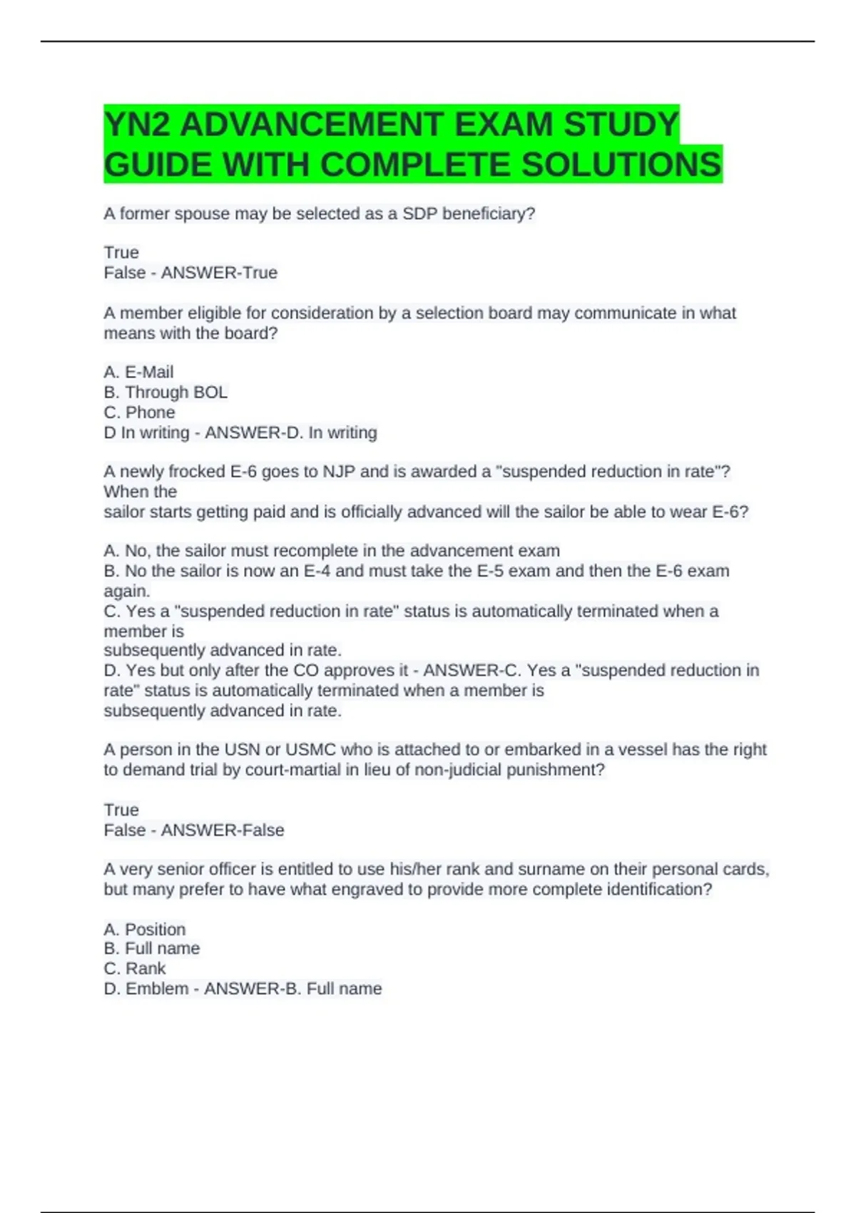 YN2 ADVANCEMENT EXAM STUDY GUIDE WITH COMPLETE SOLUTIONS