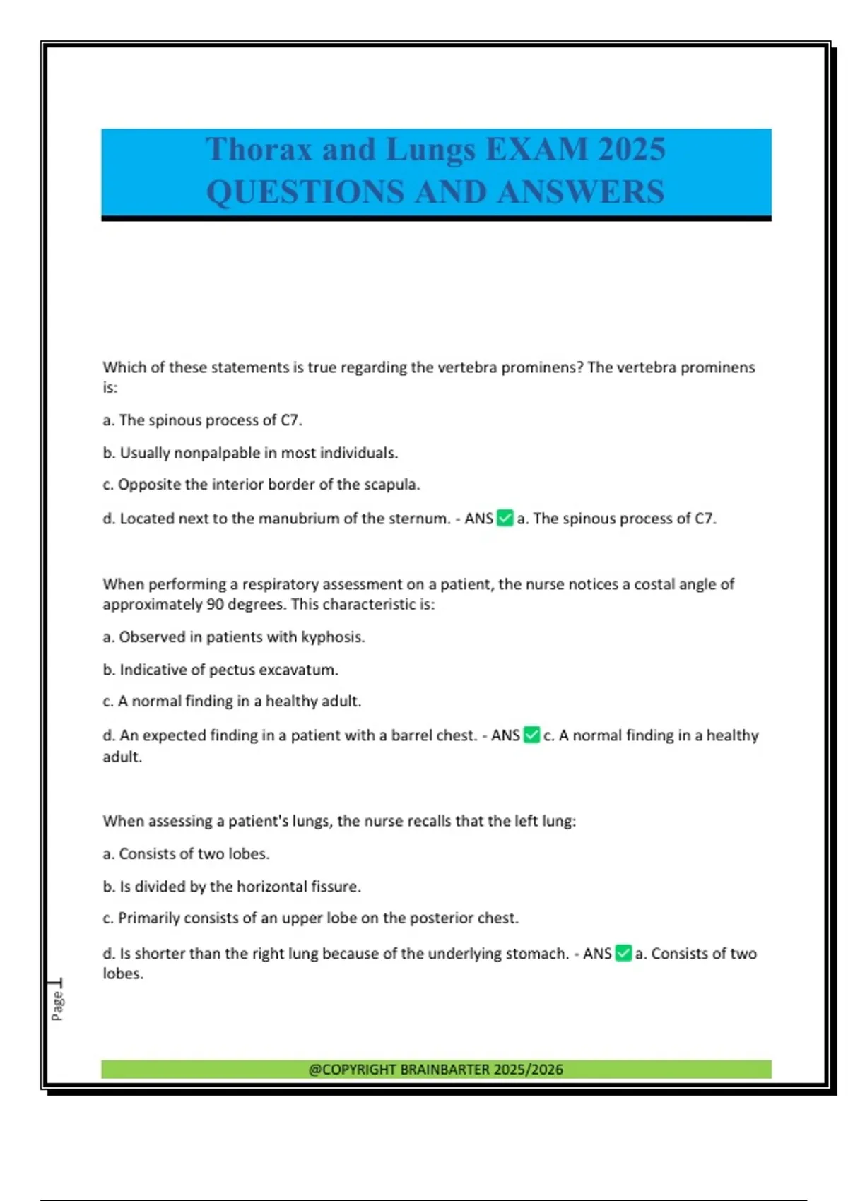 Which of these statements is true regarding the vertebra prominens? The vertebra prominens is: a. The spinous process of C7. b. Usually nonpalpable in most individuals. c. Opposite the interior border of the scapula. d. Located next to the manubrium of the sternum. - ANS a. The spinous process of C7. When performing a respiratory assessment on a patient, the nurse notices a costal angle of approximately 90 degrees. This characteristic is: a. Observed in patients with kyphosis. b. Indicative of pectus excavatum. c. A normal finding in a healthy adult. d. An expected finding in a patient with a barrel chest. - ANS c. A normal finding in a healthy adult. When assessing a patient's lungs, the nurse recalls that the left lung: a. Consists of two lobes. b. Is divided by the horizontal fissure. c. Primarily consists of an upper lobe on the posterior chest. d. Is shorter than the right lung because of the underlying stomach. - ANS a. Consists of two lobes. @COPYRIGHT BRAINBARTER 2025/2026 Page2 Which statement about the apices of the lungs is true? The apices of the lungs: a. Are at the level of the second rib anteriorly. b. Extend 3 to 4 cm above the inner third of the clavicles. c. Are located at the sixth rib anteriorly and the eighth rib laterally. d. Rest on the diaphragm at the fifth intercostal space in the midclavicular line (MCL). - ANS b. Extend 3 to 4 cm above the inner third of the clavicles. During an examination of the anterior thorax, the nurse is aware that the trachea bifurcates anteriorly at the: a. Costal angle. b. Sternal angle. c. Xiphoid process. d. Suprasternal notch. - ANS b. Sternal angle. During an assessment, the nurse knows that expected assessment findings in the normal adult lung include the presence of: a. Adventitious sounds and limited chest expansion. b. Increased tactile fremitus and dull percussion tones. c. Muffled voice sounds and symmetric tactile fremitus. d. Absent voice sounds and hyperresonant percussion tones. - ANS c. Muffled voice sounds and symmetric tactile fremitus. The primary muscles of respiration include the: a. Diaphragm and intercostals. b. Sternomastoids and scaleni. c. Trapezii and rectus abdominis. d. External obliques a