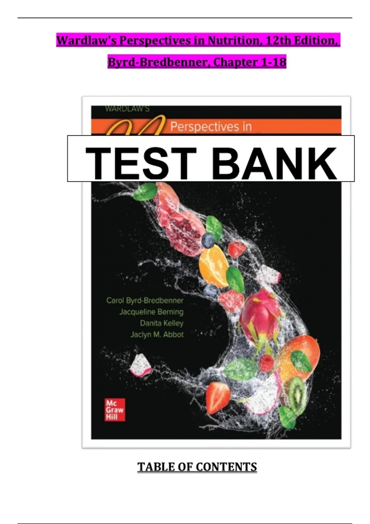 Test Bank for Wardlaw's Perspectives in Nutrition, 12th Edition, authored by Byrd-Bredbenner**, encompassing Chapters 1 through 18, serves as a comprehensive assessment tool tailored to academic programs in nutrition and dietetics. This test bank comprises a diverse array of question types, including multiple-choice, true/false, short answer, and essay questions, meticulously aligned with the 12th edition’s content and learning objectives. Covering fundamental concepts such as nutrient functions, digestion and absorption, energy metabolism, macronutrients, micronutrients, and dietary guidelines, this resource aids educators in evaluating students’ comprehension across core nutrition topics. By facilitating rigorous and varied assessments, the test bank underscores critical thinking and application of nutritional science principles. It is an invaluable resource for instructors seeking to enhance curriculum delivery and for students preparing for examinations in nutrition and health sciences. test bank Wardlaw's Perspectives in Nutrition 12th edition, Wardlaw nutrition 12th edition test bank, Perspectives in Nutrition test bank Byrd-Bredbenner, Wardlaw nutrition test questions 12e, nutrition test bank chapters 1-18 Wardlaw, dietetics test bank Wardlaw 12th edition, Wardlaw nutrition exam bank Byrd-Bredbenner, academic resources Wardlaw's Perspectives in Nutrition test bank #WardlawPerspectivesInNutrition, #NutritionTestBank, #ByrdBredbenner, #NutritionEducation, #DieteticsExamPrep, #HealthScienceEducation, #NutritionAssessment, #AcademicResources, #NutritionScience, #Wardlaw12thEdition