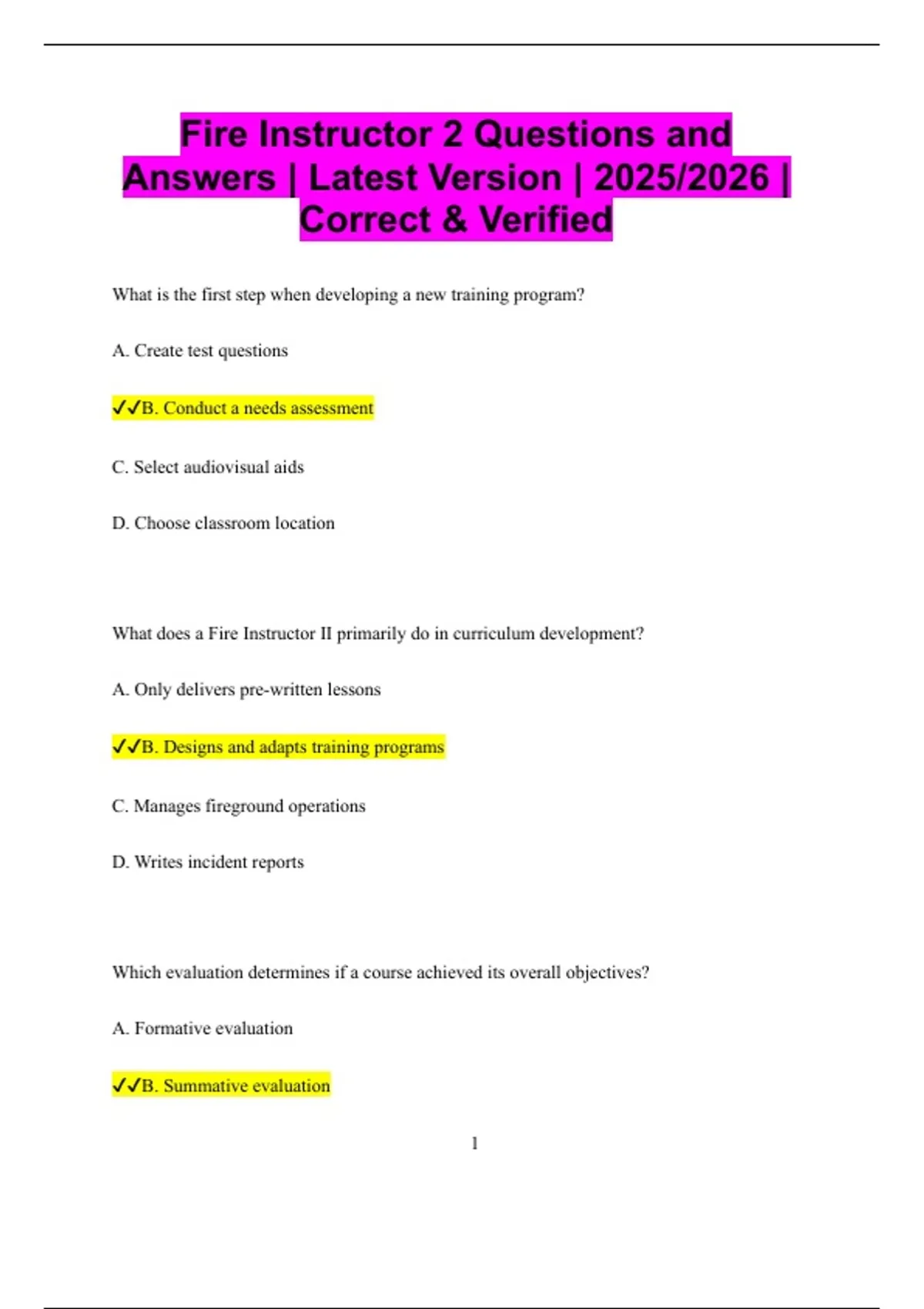Fire Instructor 2 Questions and Answers | Latest Version | 2025/2026 | Correct & Verified What is the first step when developing a new training program? A. Create test questions B. Conduct a needs assessment C. Select audiovisual aids D. Choose classroom location What does a Fire Instructor II primarily do in curriculum development? A. Only delivers pre-written lessons B. Designs and adapts training programs C. Manages fireground operations D. Writes incident reports Which evaluation determines if a course achieved its overall objectives? A. Formative evaluation B. Summative evaluation 2 C. Informal observation D. Attendance records Which type of evaluation provides feedback during training? A. Formative evaluation B. Summative evaluation C. Exit surveys D. Post-course certification Why is a training needs assessment important? A. To fill time in the schedule B. To meet instructor goals C. To identify actual skill and knowledge gaps D. To replace evaluations Which domain focuses on student attitudes and values? A. Psychomotor B. Affective 3 C. Cognitive D. Informational What is curriculum mapping? A. Aligning objectives, content, and evaluations B. Choosing classroom seating charts C. Preparing a lecture outline D. Collecting attendance How can Fire Instructor II ensure lesson consistency across instructors? A. Allow everyone to teach differently B. Skip lesson plans C. Provide standardized curriculum and evaluation tools D. Avoid giving feedback What should be included in a course syllabus? A. Instructor’s biography B. Objectives, resources, expectations, and evaluations 4 C. Only a reading list D. Only test dates Which is an example of a course goal? A. Develop firefighter competence in ladder operations B. Complete a homework assignment C. Perform a single drill D. Attend one lecture Which of the following is a course objective? A. Students will value teamwork B. Students will demonstrate proper hose advancement C. The program aims to improve morale D. The department supports safety