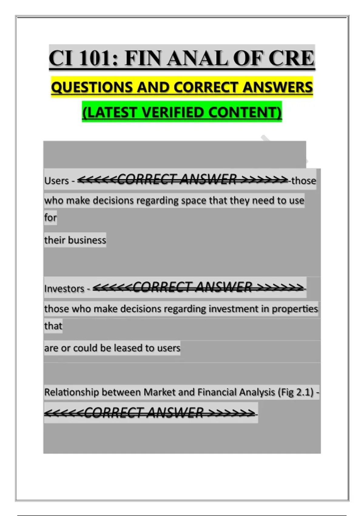 CI 101: FIN ANAL OF CRE QUESTIONS AND CORRECT ANSWERS (LATEST VERIFIED CONTENT) Users - <<<<<CORRECT ANSWER >>>>>>-those who make decisions regarding space that they need to use for their business Investors - <<<<<CORRECT ANSWER >>>>>> those who make decisions regarding investment in properties that are or could be leased to users Relationship between Market and Financial Analysis (Fig 2.1) - <<<<<CORRECT ANSWER >>>>>>- Real estate "market" - <<<<<CORRECT ANSWER >>>>>>-geography or property type or transaction type etc. Feasibility Analysis Model - <<<<<CORRECT ANSWER >>>>>>-Figure 2.2 GIS - <<<<<CORRECT ANSWER >>>>>> geographic information systems - putting data to maps. Any system that captures, stores, analyzes, manages, and presents data that are linked to location.