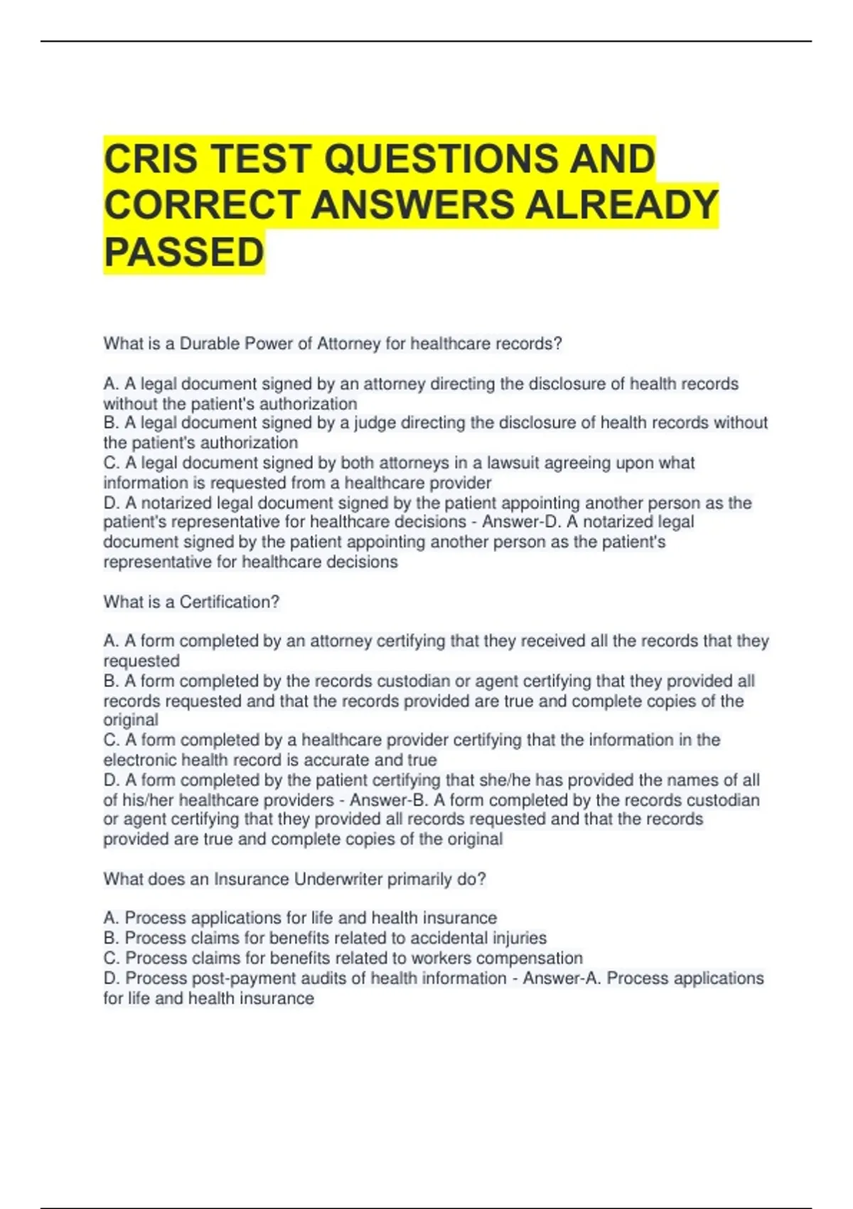 CRIS TEST QUESTIONS AND CORRECT ANSWERS ALREADY PASSED