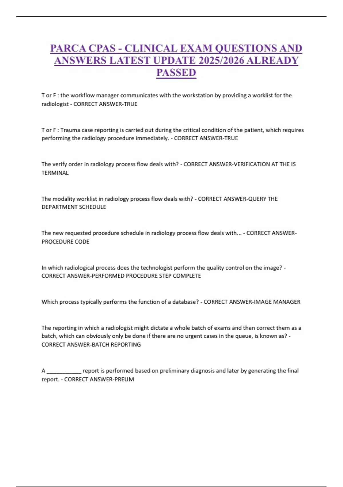 PARCA CPAS - CLINICAL EXAM QUESTIONS AND ANSWERS LATEST UPDATE 2025/2026 ALREADY PASSED