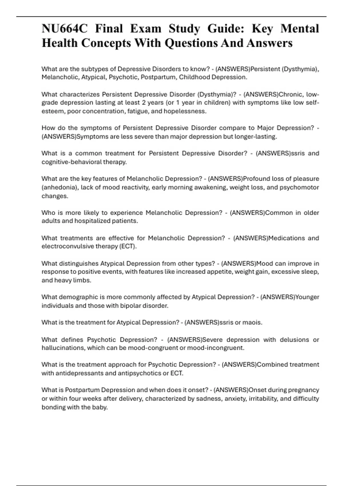 NU664C Final Exam Study Guide: Key Mental Health Concepts With Questions And Answers