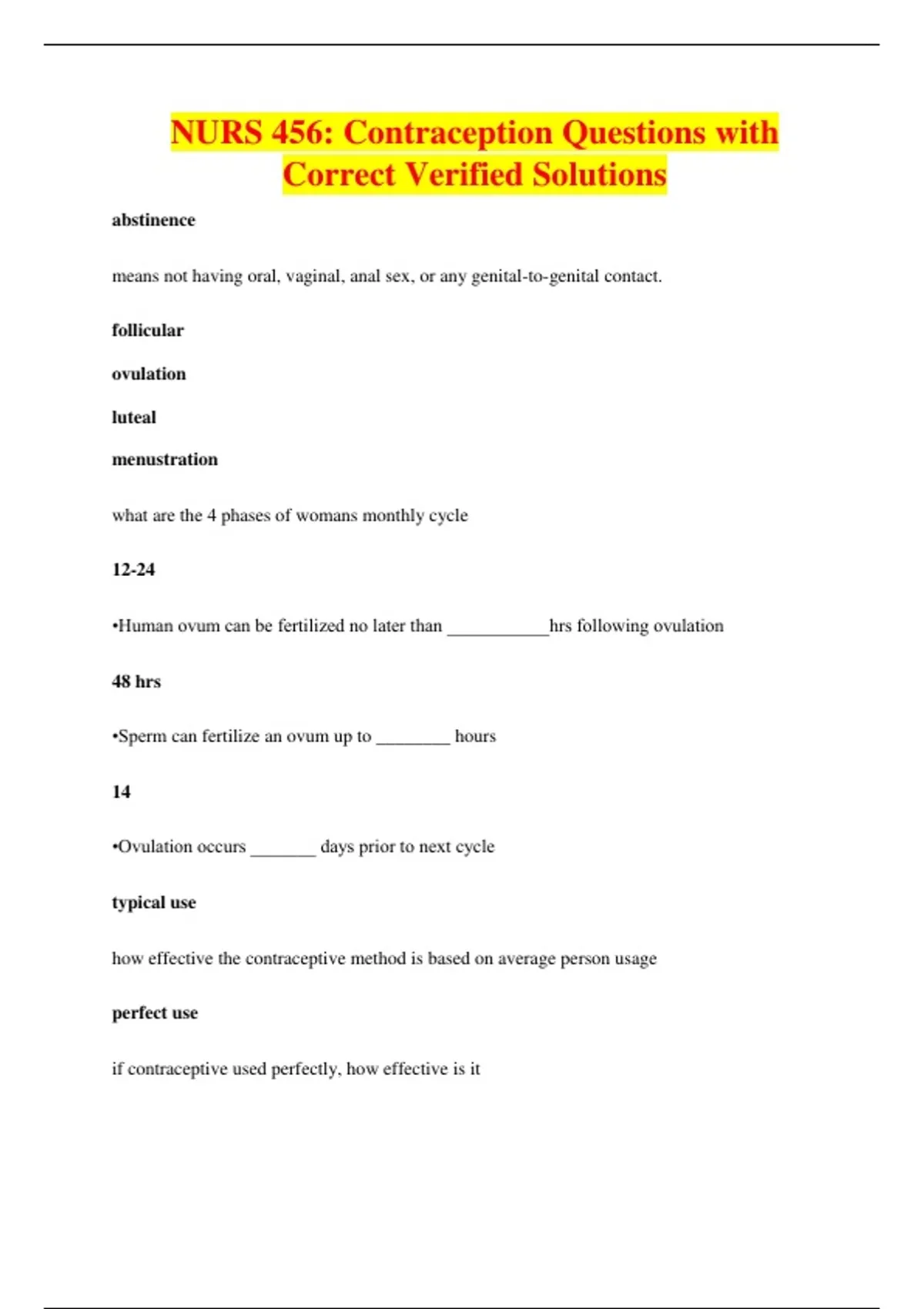 NURS 456: Contraception Questions with Correct Verified Solutions